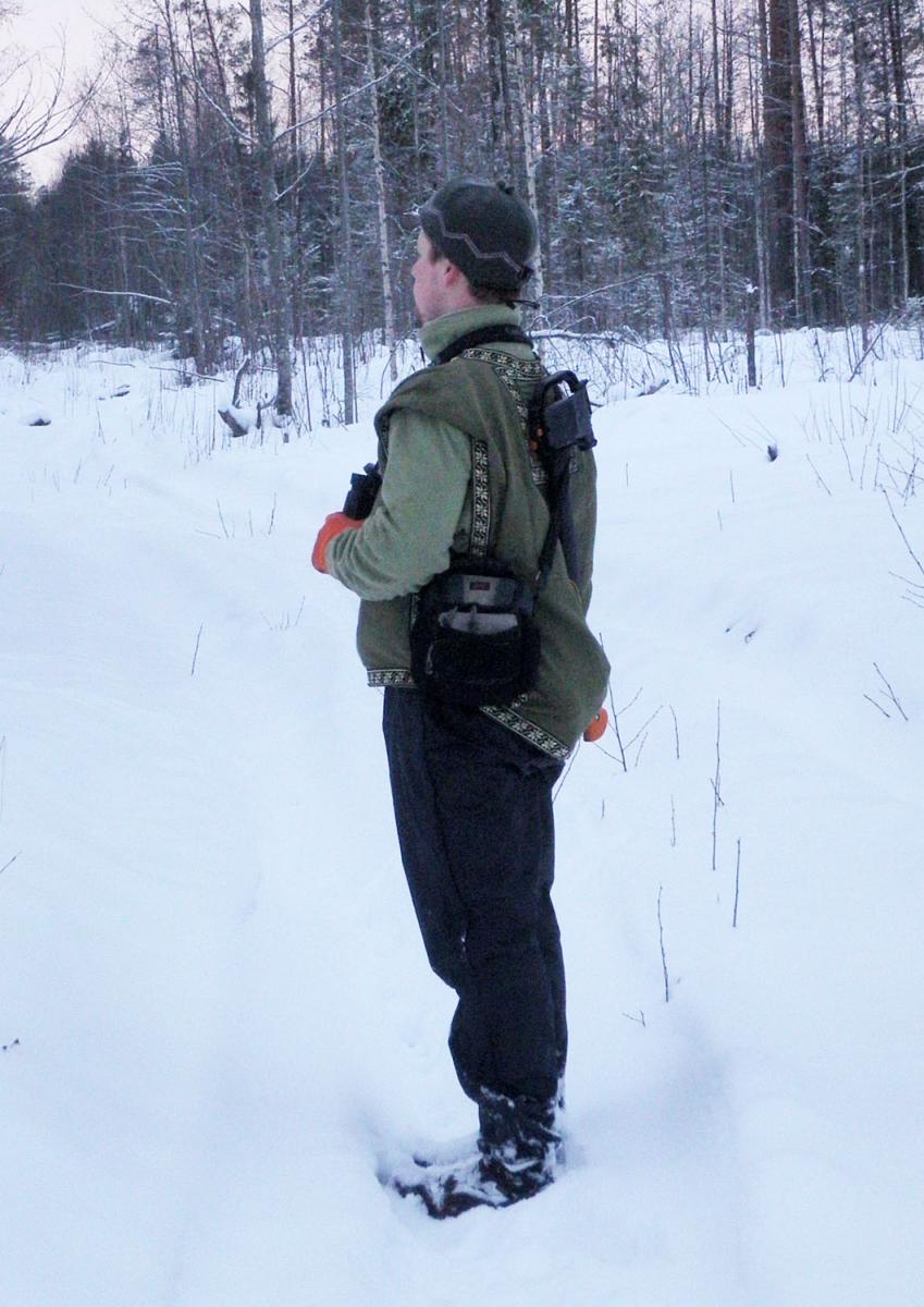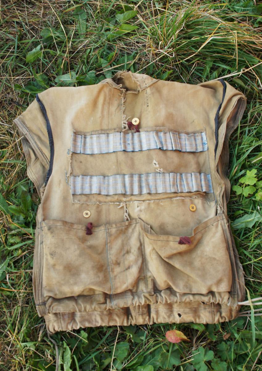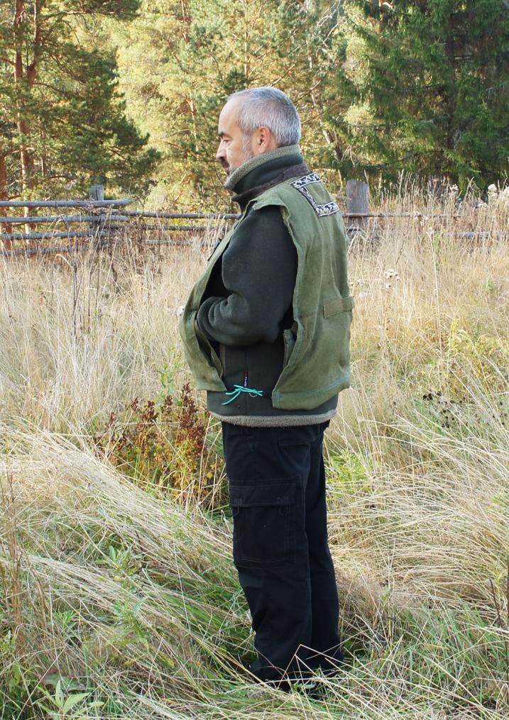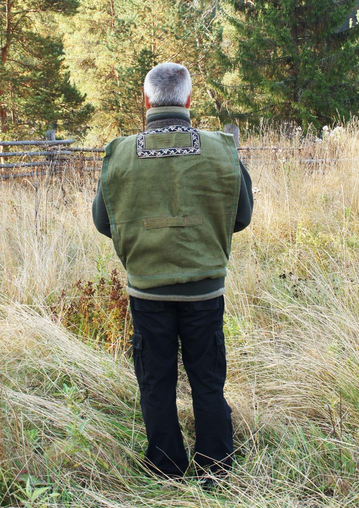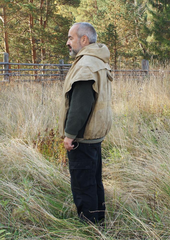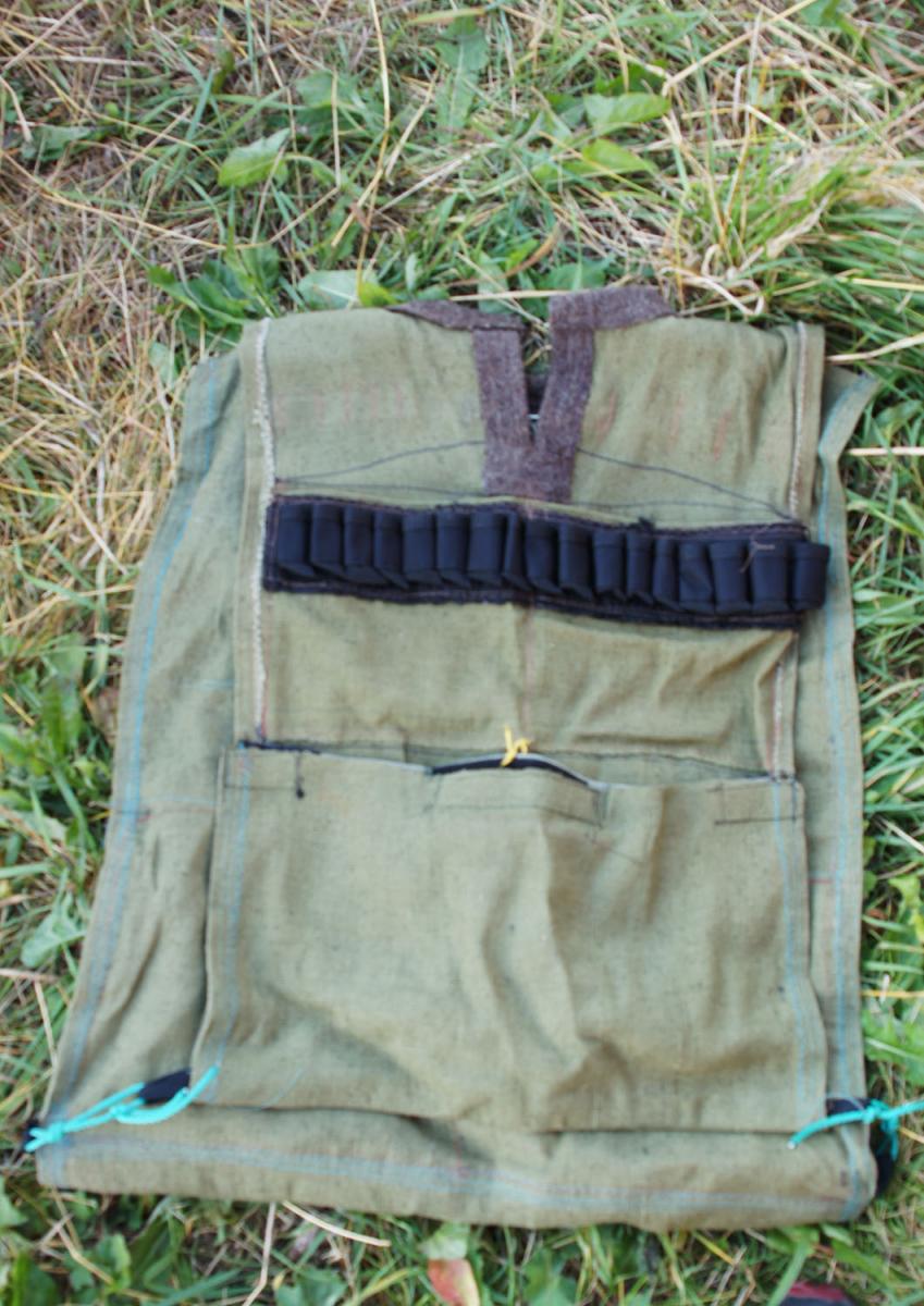 Неочень удачен. Спереди узковат, сзади слишком широкий и короткий. Нашитый навнутренний верхний карман патронташ слишком груб, надо отпороть и нашить ленту.Так же неудачным оказалось решение заменить петлю для топора карманом. Думал,что это для лучшей безопасности, но, оказалось слишком неудобно, топорприжимается к плечам и рукоятка торчит под углом к телу. Надо будет пришитьпетлю. Зато удачной оказалась окантовкаворота шинельным сукном и нашитые спереди петли для бинокля, навигатора ирации, а так же для патронов нарезных и гладких - на случай ЧС по типу газырей.