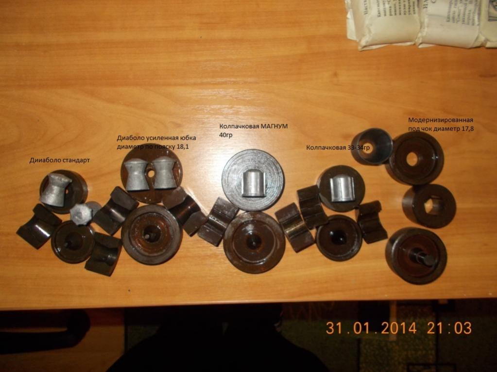 Пулелейки: Диаболо 12к диаметр 18-18,1 с пояском(35гр), Колпачковая по чертежам с инета 33гр(18,3мм), Диаболо по чертежам с зубчиками(ничего не менял 18,3-18,4 35гр), Колпачковая со сквозным отверстием как у майера вес 31гр под ЧОК диаметр по пояскам 17,7-17,8