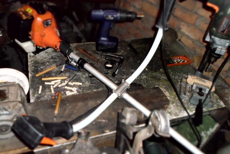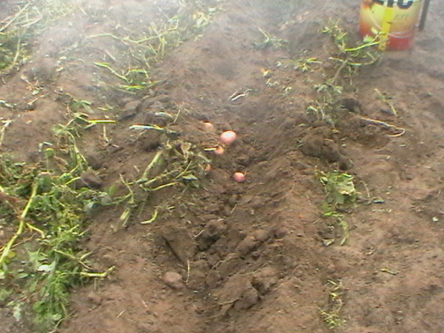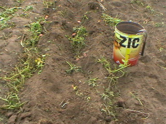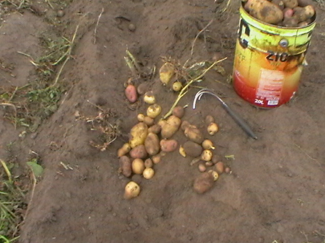 Ну и тут ведро накопаной картохи, с самодельной загребушкой из проволоки, и куска водопроводного шланга