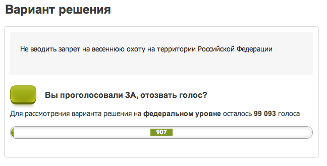 Вы сами можете видеть по результатам голосования, что зеленые тоже голосуют. Но будем надеяться, что эта низкая активность охотников только в начале. Самое главное не откладывать голосование тем кто еще не проголосовал и не искать причины этого не делать к примеру: охота, влом регистрироваться на портале госуслуги, дальше лето, дача и т.д. и т.п. Сделайте это сейчас и не откладывайте на потом и где только можно тормошите своих друзей, товарищей и знакомых что бы тоже проголосовали иначе будет поздно и зеленые нас задавят своей АКТИВНОЙ гражданской позицией.