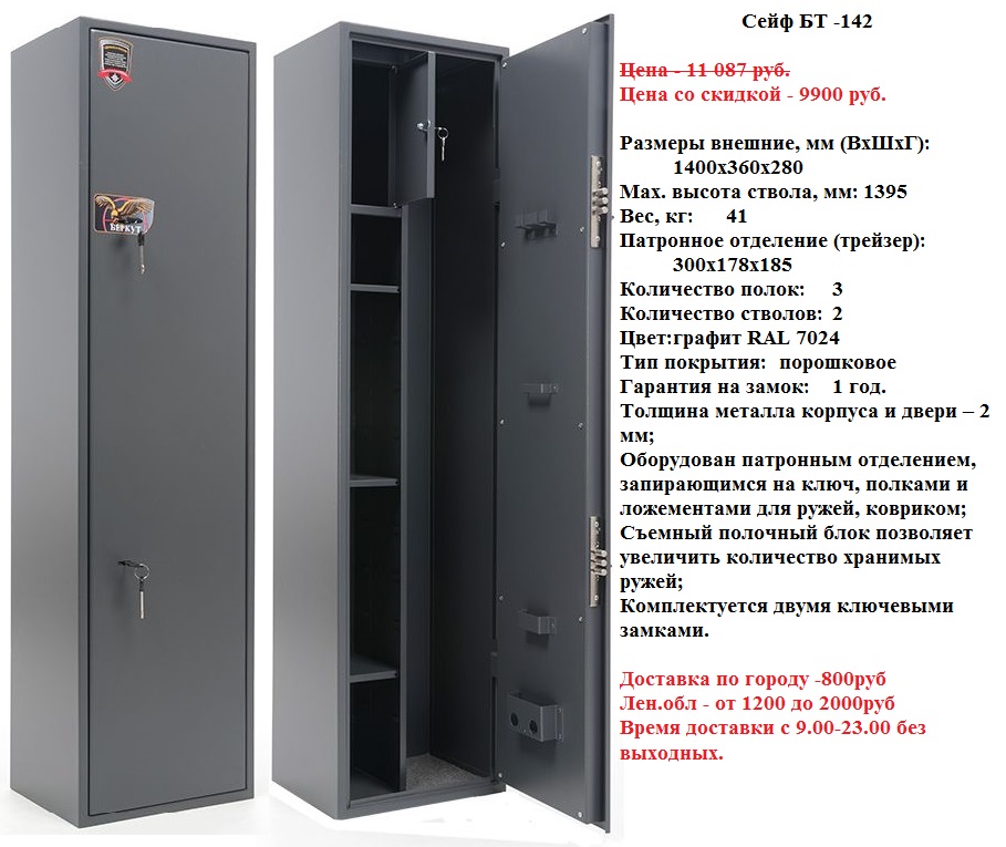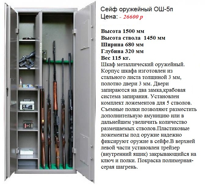 Шкафы,сейфы для хранения пистолета, гладкоствольного и нарезного оружия, которые полностью удовлетворяет требованиям МВД к хранению оружия и правил оборота гражданского и служебного оружия и патронов к ним. В связи с тем, что я не так часто бываю на форуме, могу не увидеть ваши сообщения, поэтому если я не ответил вам, то звоните или пишите пожалуйста в WhatsApp или Viber на номер 8(931)221 21 34 Сергей.