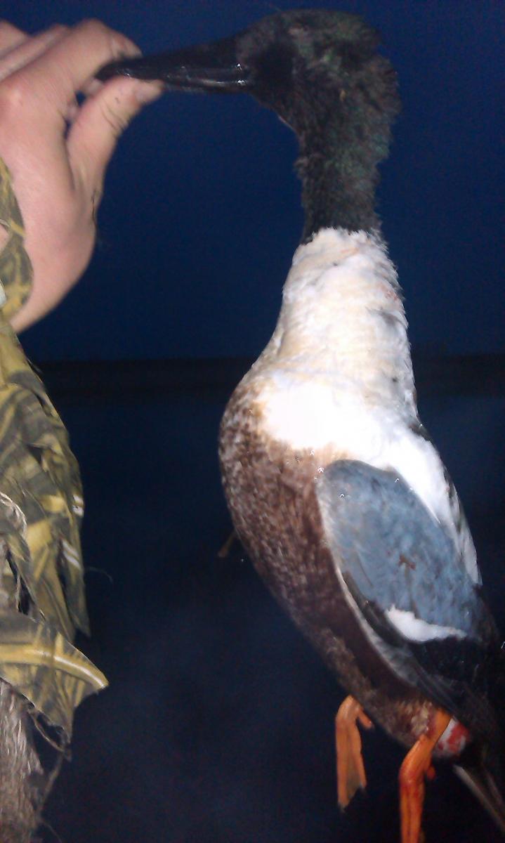 Оказалось это место облюбовали широконоски. Пошел забирать селезня,ввалился в ямку в реке, чувствую по ногам потекли ледяные струи. Приятного мало, забрал утку и быстрее на берег сушится. отжался, вылил воду из сапогов и решил сниматься, заморозок все таки, да и ногам ну очень холодно. Собрался иду, тут вижу впереди на пруд, где сидел с утра, вижу садится красавец крякаш. ну думаю, пока не сильно замерз-постараюсь я тебя взять. вижу впереди лужину, скидываю рюкзак, одеваю маскхалат, все прячу, высаживаю утку. Та начинает орать, и селезень сразу поднимается с пруда и летит в мою сторону. лужица, в которую я высадил утку-размером 1х1 на поле, сам тут же, решил я не рисковать и взять его на подлете. Подлетает он красавец, жвякает, выстрел-взят. подхожу забирать трофей, поднимаю красавца, а лапы у него краснющие-сразу видно профессор, которые себя не один сезон сохранил, а тут попался в поле. После этого собираюсь и чуть не бегом домой-холод пробирает. Вот такое утро.