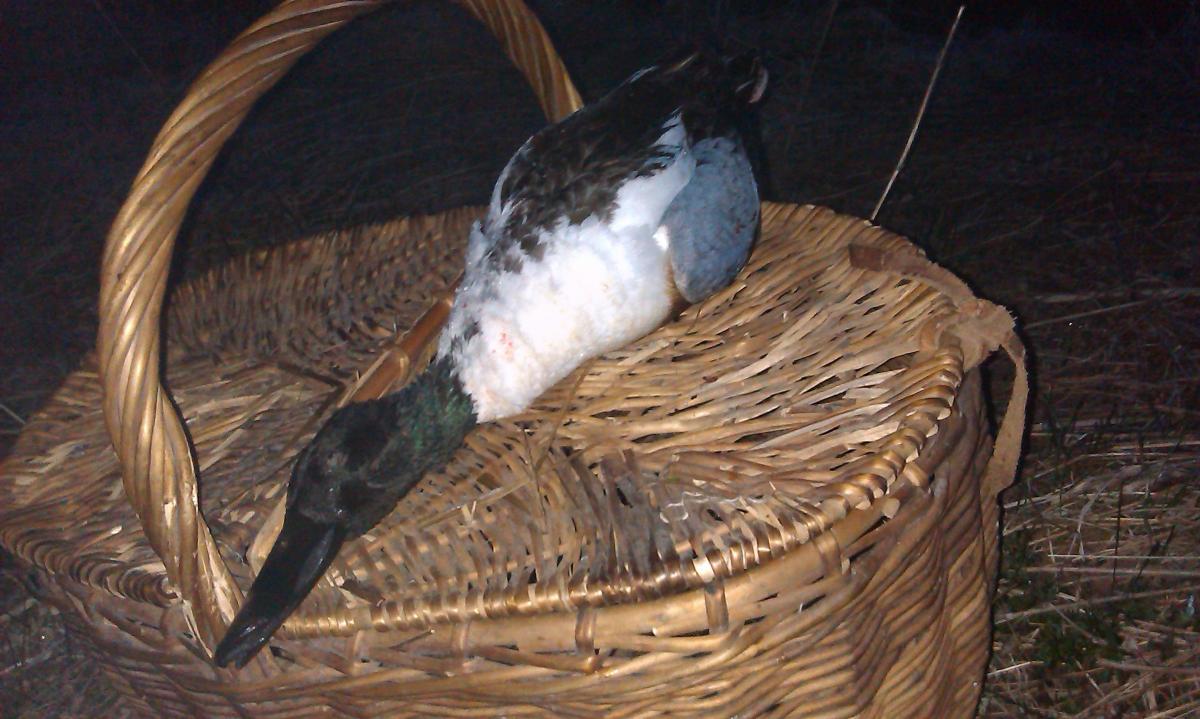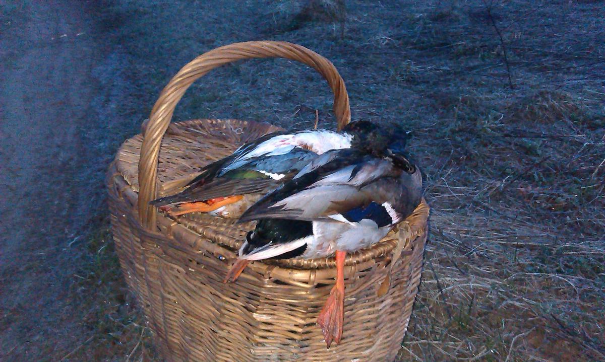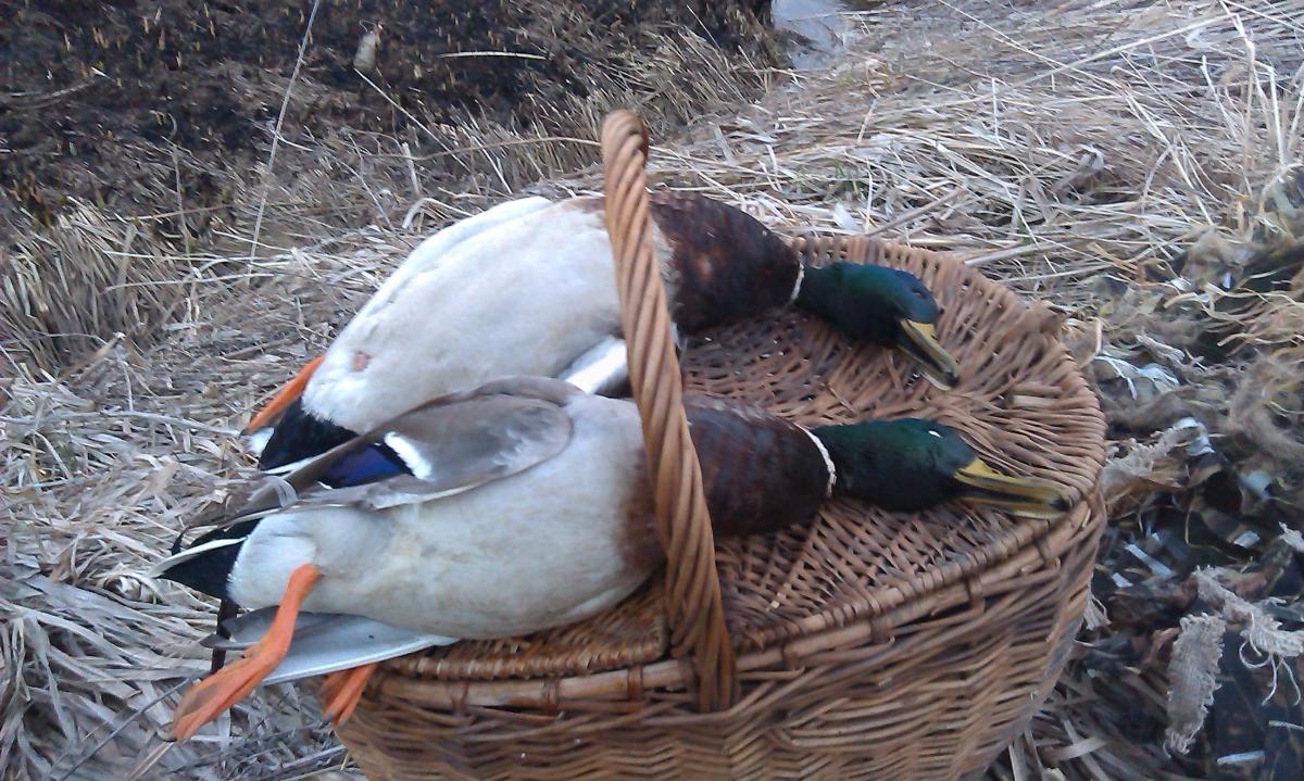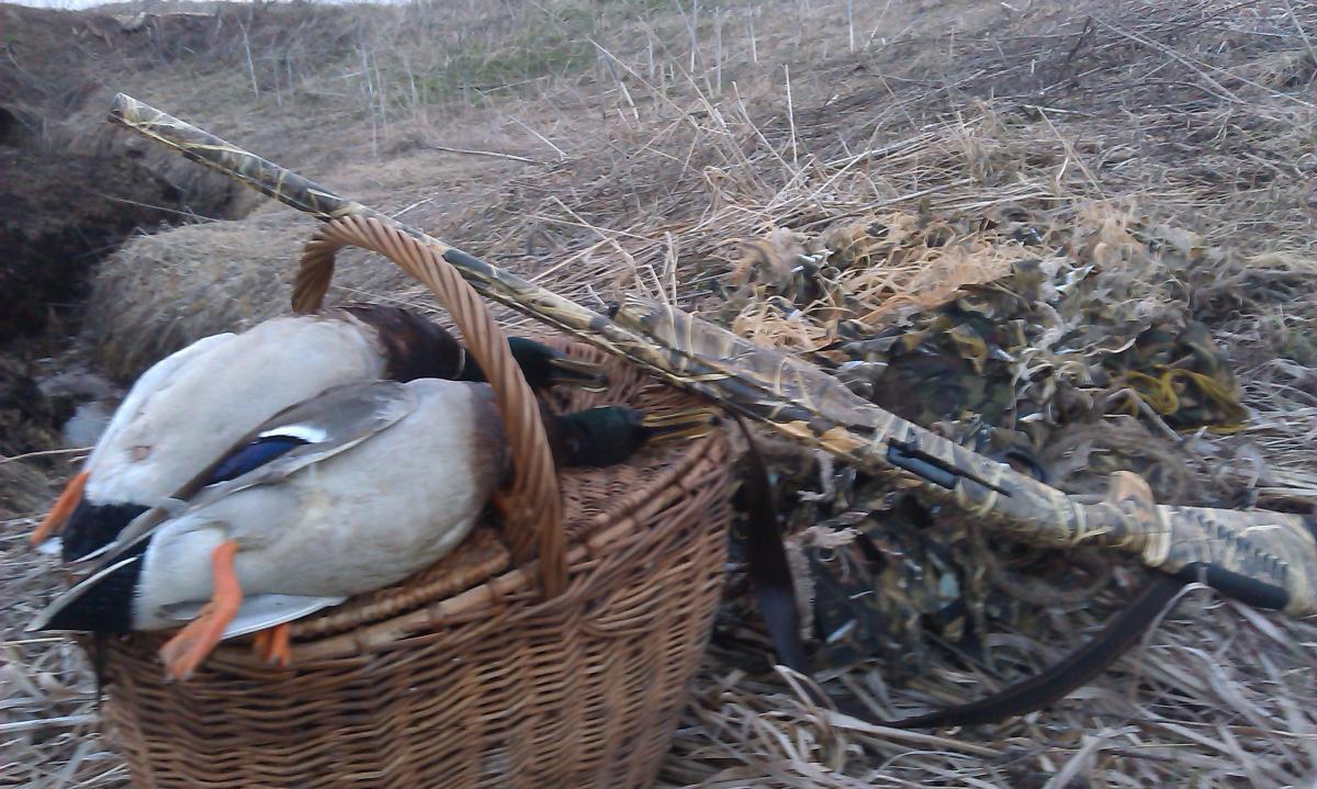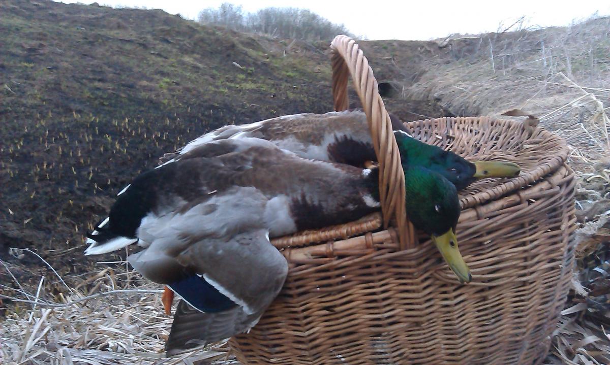 Так как до этого вылазки с подсадными не приносили должного результата, а именно, то в угодиях утки нет, то ее гоняют бедную, сегодня решил проверить свои места рядом с городом. В выехал из дома, заехал взял уток и на ближайший пруд, с которого всегда снимал по весне несколько крякашей. Пруд в этом году меня сильно разочаровал-зарос камышами воды практически нет, высадил утю тут, скорее можно назвать уже не прудом, а лужей. Тишина полнейшая, нигде уток не слышно. просидел примерно около получаса, когда стало светать, понимаю, что надо менять место-утки все равно не летают, да и место не понравилось. Пошел на другой пруд, до него 5 минут, там тоже не айс, водной глади 5х7, высадил утку, вокруг птицы летают, чайки по реке идут, тетерева токуют, а тут тишина. Просидел минут 5-10, понимаю, что надо менять дислокацию. решил перейти на реку, где есть небольшая коса, там всегда осенью сидели утки. Дошел до туда, уже светает, на этом месте прямо у берега вижу 2 пары уток. Вижу, что селезень один, утки как-то странно кричат, никогда не слышал, чтобы так утки кричали, пока подошел, они отлетели. ну думаю вернетесь, если сильно не напугал. Высадил утку, вторую оставил в корзинке. Утка работает, но крякашей не видать и не слыхать.сижу тихонько на берегу, покуриваю, ружье лежит на земле, ну думаю охоты нет и не будет-утки то не летают, но тут видимо бог охоты сжалился и недалеко метрах в 70 сел чирок-трескунок, и начал распеваясь тихо плыть к крякухе. Сижу жду, а он метрах в 60 встал на крыло и пошел водой, искать другой любви. Сижу дальше, встал на корточки и тут краем глаза замечаю, что в метрах 50 плывет пара уток в мою сторону. Плывут медленно, постоянно озираясь, утка впереди, а селех сзади. Я про себя думаю, сижу на берегу почти открыто, благо маскхалат одел, сделанный в том году. Утки плывут, постоянно осматриваясь по сторонам. Я еле еле двигаюсь, медленно, ну очень медленно поднимаю ружье- поднимал я его минуты 3, все за это время утки озираются по сторонам, у меня все части тела затекли. Утка проплывает мимо, я тихонечко вкладываюсь, как я в наклоне стрелял, наверно можно было снимать кино. Выстрел-все, Трофей взят.