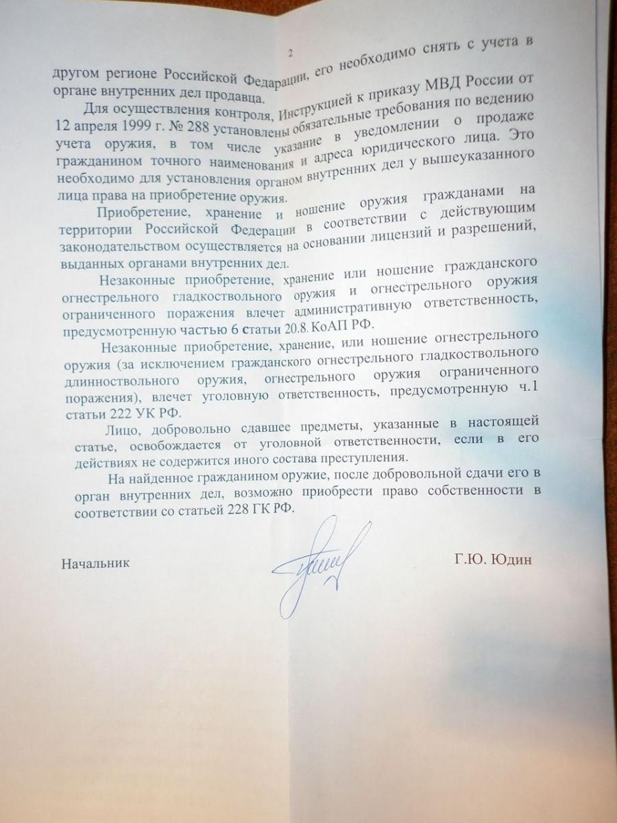 В связи с чем прошу: обеспечить сохранность ружья модели ИЖ-К 16 калибра серии 'Е' номер 87892 до истечения срока в 6 (шесть) месяцев со дня обнаружения находки.