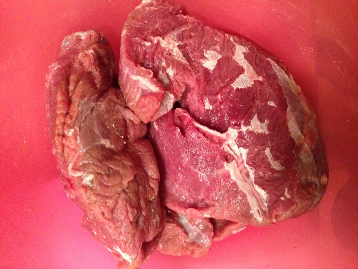 Берем в морозилке "кусочек" (было примерно 1,5 - 2 кг) мяса, размораживаем при комнатной температуре. у нас это заняло около 10 часов