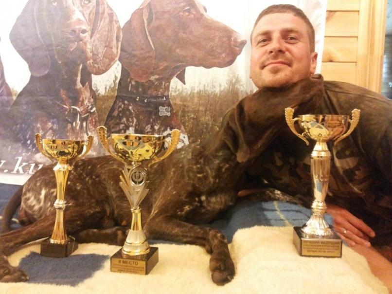 Первое место курцхаар Ида ведущий Белов Андрей Диплом второй степени 72 балла. Полевой победитель.