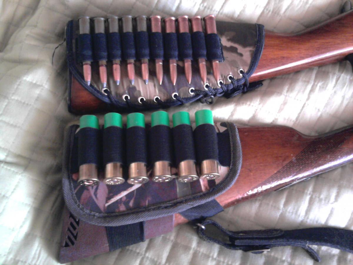 Пользую патронташ из синтетического материала сверху и очень мягкой ворсистой ткани внутри, крепление одна резинка, вторая липучка, на 6 патронов.