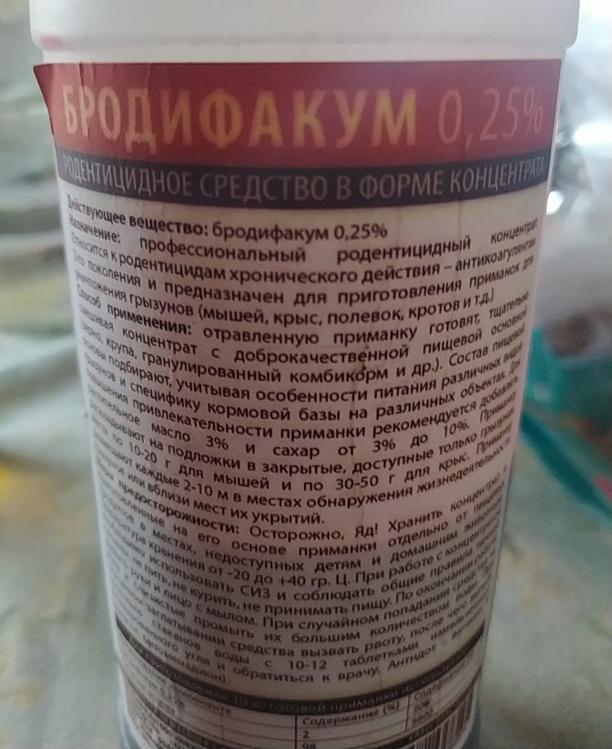 Пользую такую штуку. Но естественно закладку делать вне доступа кур котов .... куда нибудь в щелку, под пол. Количество 'вкусняшки' сыпем исходя из количества тварей. Постоянно подсыпаем. Через 'пару' дней дохлые твари везде. Есть минус - если сдохли внутри, например под полом. То будет через недельку вонять.