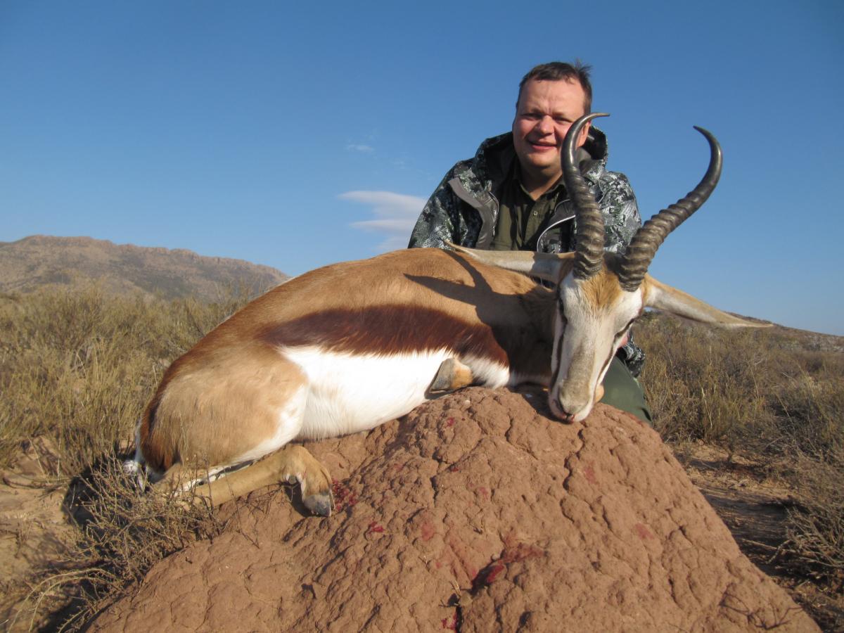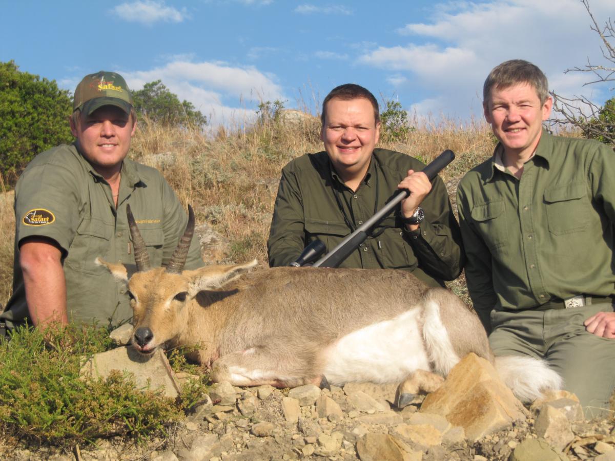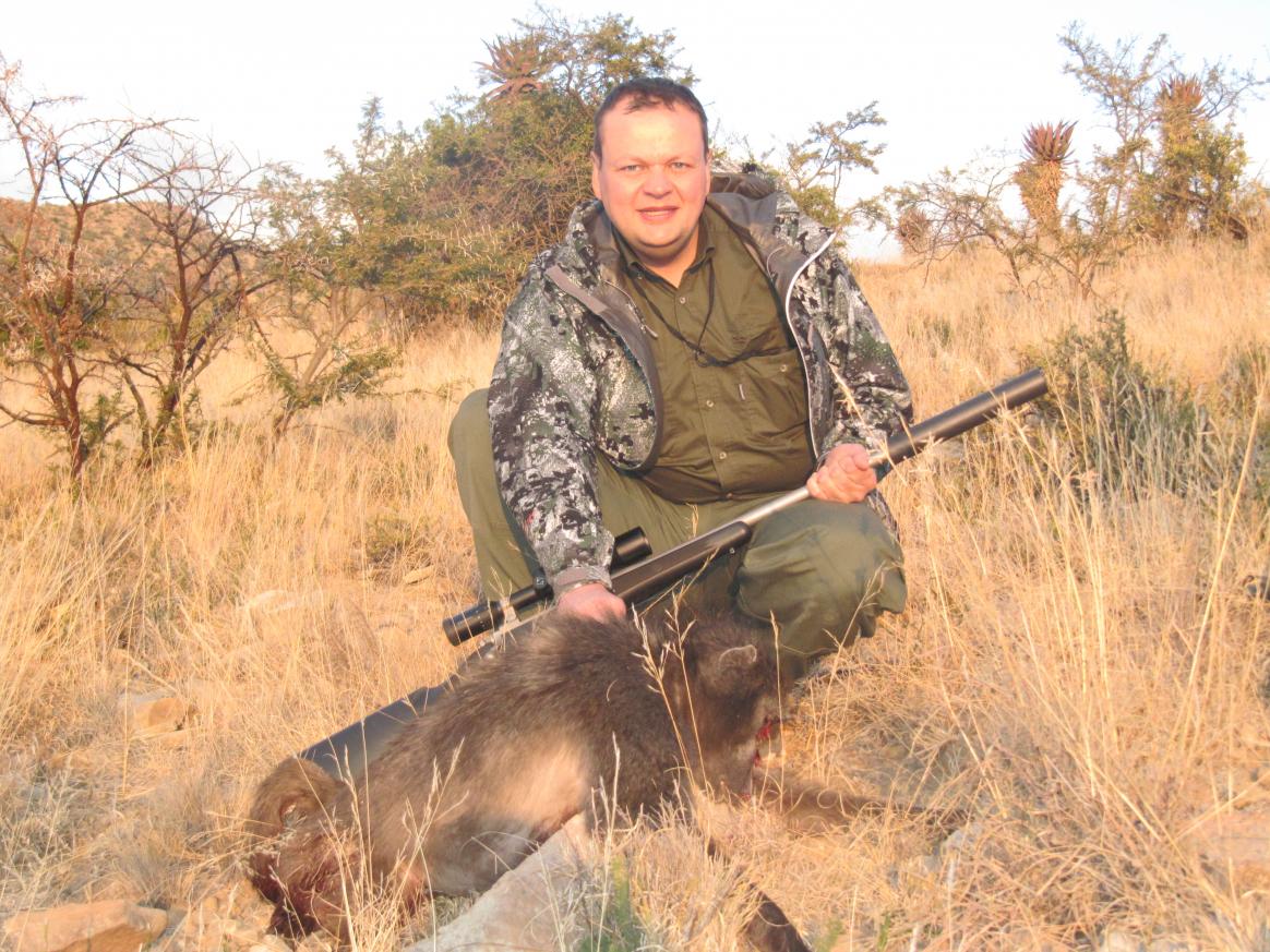 29 июня сего года я со своим приятелем Дмитрием отправился на африканскую охоту. Я соответственно по работе больше, посмотреть , запечатлеть, тем более было немного свободного времени. Летели до Германии Люфтганзой, а далее авиакомпанией ЮАР. Полет с пересадками занял целые сутки времени. В Ист-Лондоне нас встречал мой друг Кристоф Бо, он местный аутфитер, француз. После обеда в кафе на берегу Индийского океана, его Тойота взяла курс на север. Так за разговорами незаметно пролетело время до прибытия в первое хозяйство где мы планировали начать охоту. Это хозяйство раскинулось на 15 тысяч гектаров в горах. Оружие мы арендовали на месте, это был рюгер в 300 калибре и швед в 6.5 на 55. Оружие в идеальном состоянии. Стоимость аренды 50 баксов в день и 2 доллара патрон, чему мы удивились, т.к. стоимость патронов в России значительно больше. Познакомились с управляющим Пайном и его женой Беатрич, и соответственно заселились в лодж. Номера нас вполне устроили. В это время к домам подошли носороги с обрезанными рогами, так делают что бы их не трогали браконьеры. Стали их фотографировать, ну как же иначе, так близко их в свободном содержании я не видел. Вечером проехались по хозяйству, этакие серпантины по склонам гор, которые были сделаны тяжелой техникой. Наверху нашему взору предстало горное плато. Вдалеке заметили группу бабуинов, которые мгновенно слиняли. Это очень вредный зверь там, и его повсеместно в хозяйствах пытаются истребить. Но сделать это не так то просто. По моему мнению это самый трудный зверь для добычи. Хитрые, прекрасно видят и слышат, и подставляться по пулю не хотят. Ничего если позже продолжу, неотложка.