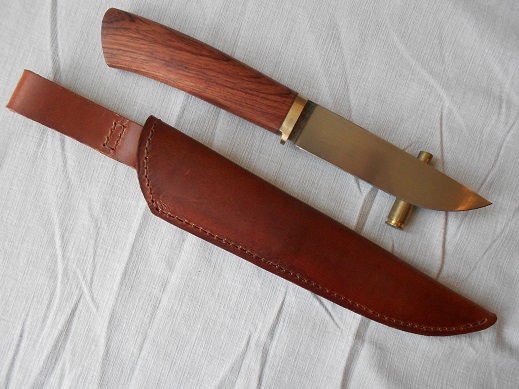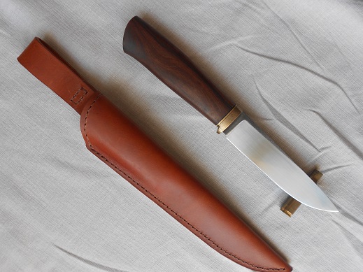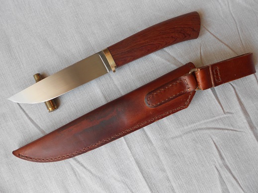 Второй, клин к-110, 61-62HRC, 131х28х4, сведен около 0,25, спуски от обуха, продольный сатин на 1000 грит, больстер бронза+G-10, упор менее 5 мм, рукоять импортная деревяха, скорее всего кингвуд, пропитка даниш ойл. Ножны шведский чепрак, пропитка воск. ПРОДАН