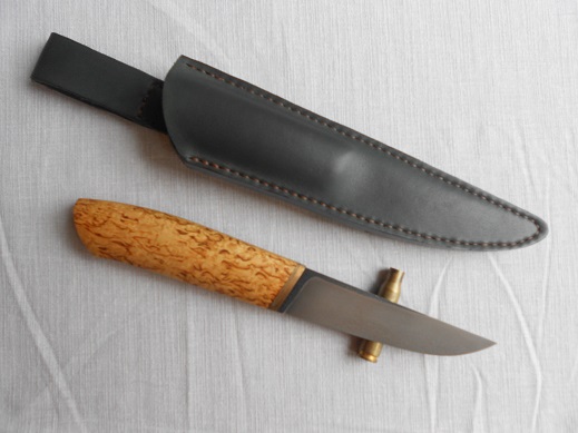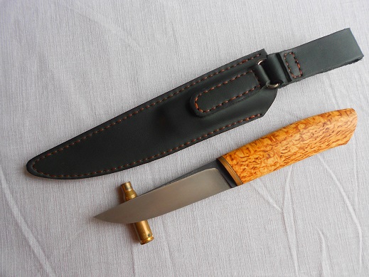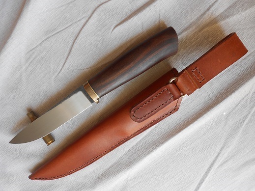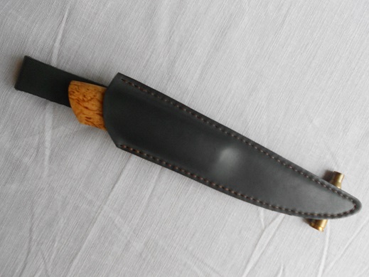 Добавлю еще один, клин к-110, 60-61HRC, 110х28х4, травление в ХЖ, больстер бронза+фибра, рукоять карелка, пропитка даниш ойл. Ножны чепрак, пропитаны. Продан