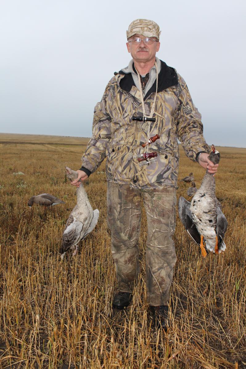 Немного погодя наманиваем три белолобых, Александр выбивает одного , я опять решечу небо свинцом.