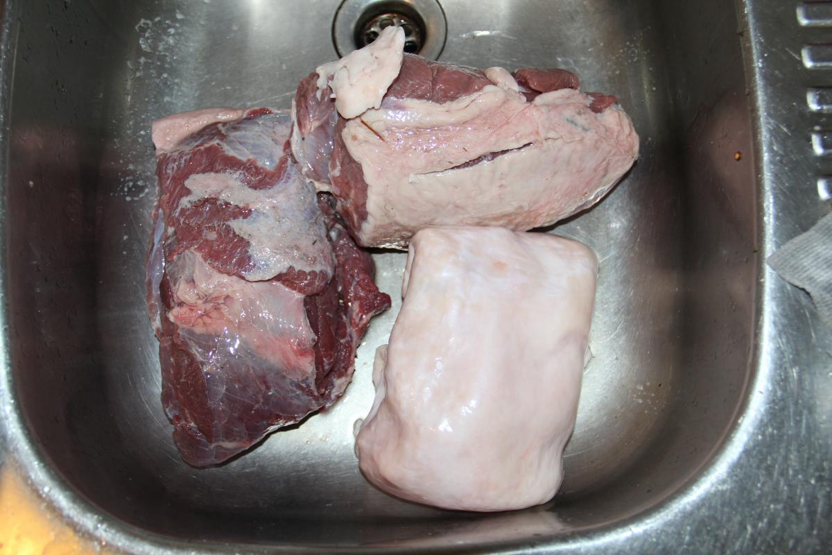 коротенько с фоточками , кто то может облизнётся и пойдёт готовить тоже. , готовить люблю особенно когда мне не мешают , так вот жена на сутках дочка учит уроки а мне скучно . ну как это у меня бывает полез в морозилку после устойчивого желания на выходные сделать что ни будь . Учитывая что в морозилки укладывает всё жена и только она знает где что там лежит то результат был не предсказуем, но судьба повернулась правильной стороной и я достал правильное мясо , это было два куска кабанятины и шмат внутреннего сала.