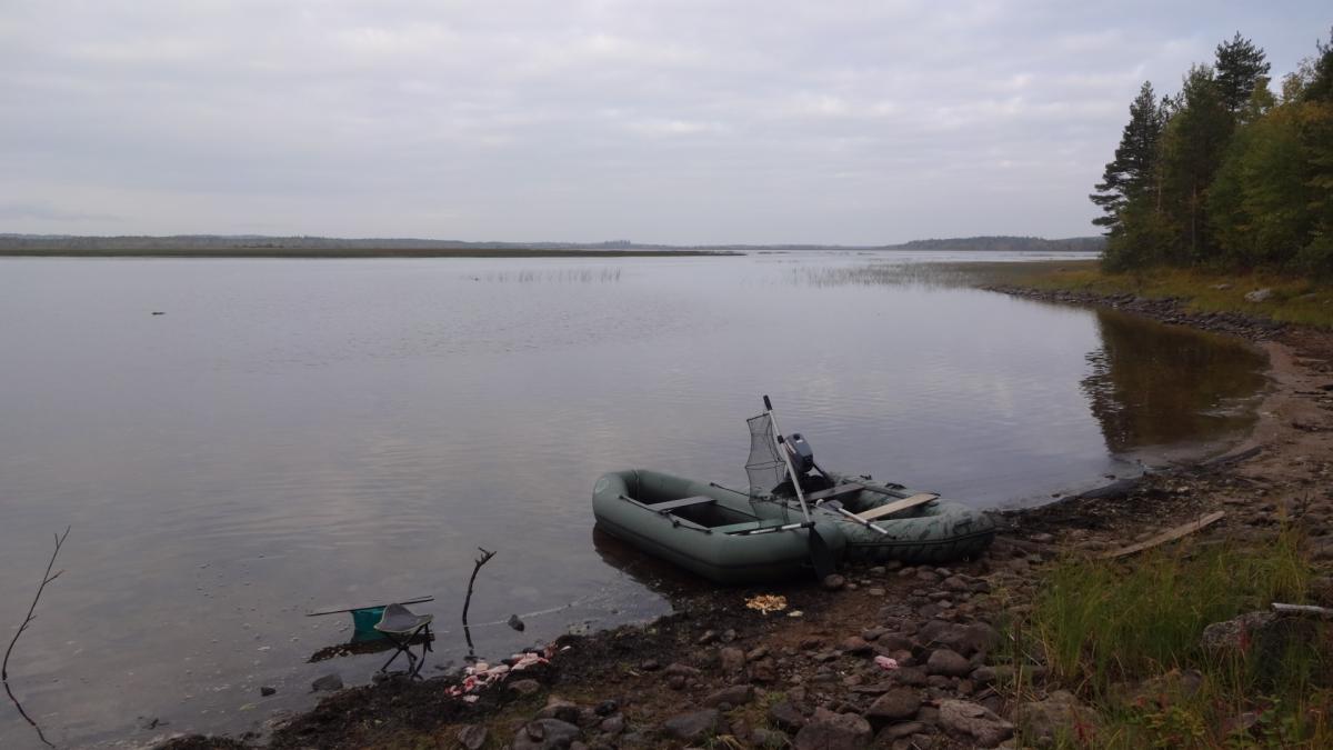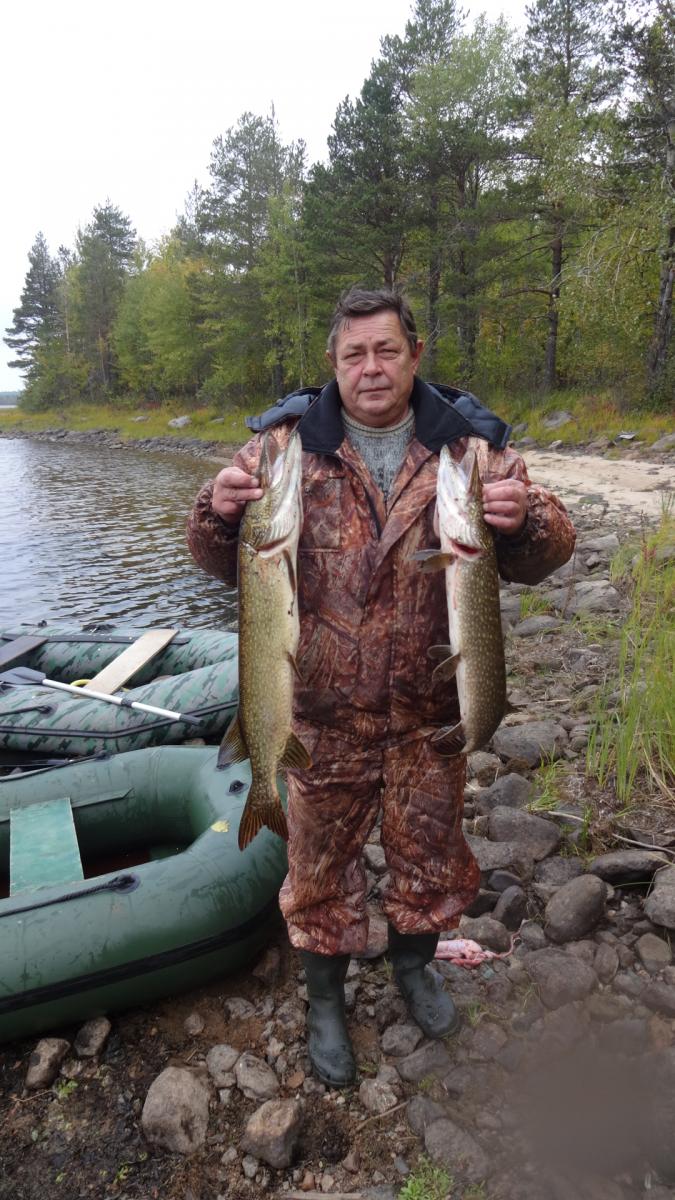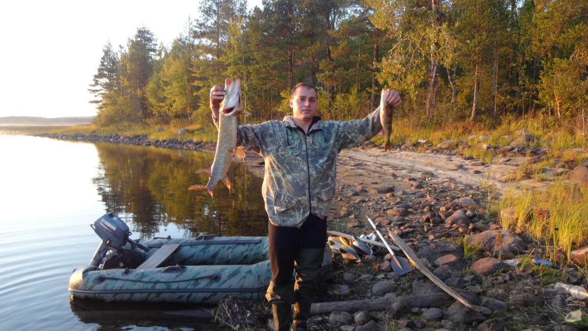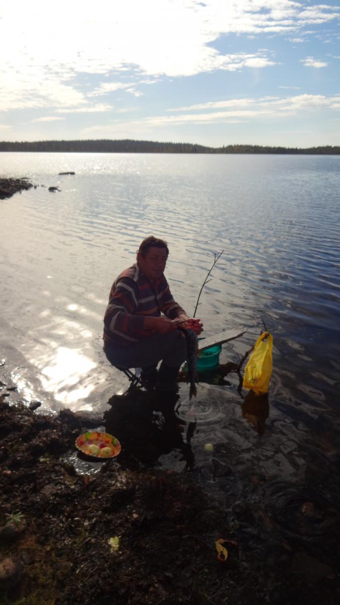 Уже давно с отцом собирались посетить карелию. Именно заповедные ее уголки. И в 2014 году решились. 15 сентября он приехал из Казахстана в питер и уже 16го мы выехали. По совету однофорумчанина, выбрали озеро в кемьском районе. Ехать до него 900 км. Но так как давно с отцом не виделись, дорога прошла за разговорами. И в 9-00 мы были уже в петрозаводске. Только к 10-00 удалось взять путевку в УОП...Я оплатил 520 руб, но в путевки вписали все, чтио шевелиться. УТКА,ГУСЬ, ВАЛЯ,ГОЛУБЬ, РЯБЧИК, ТЕТЕРЕВ,ГЛУХАРЬ, ЗАЯЦ, ЛИСА, ЕНОТ и че-то еще было...По пути отец восхищался пейзажами. DSC01877.jpgDSC01879.jpgDSC01880.jpg. В казахсьтане у нас лесостепи, А тут гористая местность севера. После 900 км, паромная переправа (150 руб с приезжих, 100 с местных (так нам рассказали) ЗАбегая вперед скажу, что туда мы заплатили 150 , обратно 100...Оказывается, это были разные оператры парома и 1 из них 50 рубликов заныкал. ПЕреправились, и 5 км ехали до ближайшей к озеру деревни, у бабули оставили тачку (за 500 р) и 3,5 км плыть по реке до самого озера. Лодочки у меня маленькие, а шмоток много. DSC01881.jpgDSC01882.jpg. Нашли небольшой бляжик у неплохого леса. И расположились. DSC01883.jpgDSC01884.jpgDSC01886.jpg. Конечно задобрили мать моржиху, деда-лесовика...Ипоехали ловить живцов. Ах, да, рыбачить мы собирались исключительно на живца. Я брал 2-3 блесн, но такой вид рыбалки меня не прет. Поначалу было трудно его поймать, но потом приноровились. Нашли где река протекает через озеро, и встали на границе потока и тишины. И тут начался бешенный клев. за час мы наловили 20 живцов, самый маленький грамм 100. Плотва, елец. Один раз даже щуку на червя зацепил, грамм на 800-900, но подвести к лодке не удалось. После 5 мин борьбы, сошла. Расставили живцов и к костру.