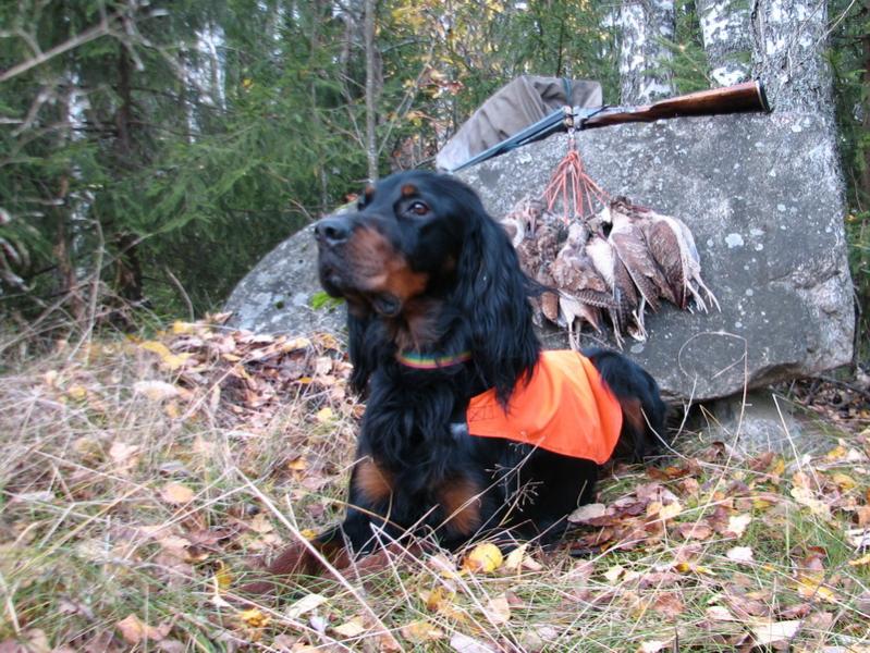 28 воскресенье. Во второй половине дня удалось вырваться на пару часов с Лакки в лес. Проверили опушки. Погода была классная, но очень сильный ветер. Может быть это заставило вальдшнепа бегать. Один раз Лакки вел такого беглеца метров сто пятьдесят, но тот все равно умудрился взлететь вне выстрела. Другой обогнул по дуге нас и взлетел за спиной. Всего было шесть работ. Два вальдшнепа оказались на тороках. Высыпок не наблюдали.