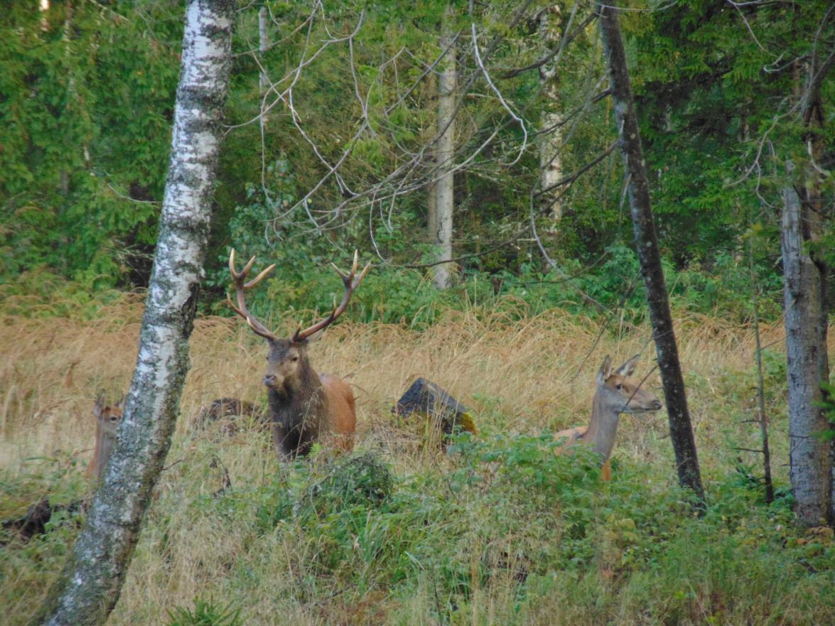 Очень тихо и медленно преодолеваю последние пару десятков метров, до края вырубки. Там стоит вышка. С земли ничего не видно. Тихо поднимаюсь на пару метров, и замераю на лестнице. Вот он, красавец, стоит в семидесяти метрах. Полумрак ещё не даёт ему разобратся, кто там появился. Стоит и смотрит. Дальше пара оленух медленно уходят. От них только головы да уши и видны. Бык серёзный, около десяти лет. Массивную шею держит довольно низко, ветвистия рога, на четырнадцать отростков, хорошо за метр длинной. Белые кончики рагов буквально горят свечками. Стою любуюсь. Он тоже, но наверное, он мою красоту не так высоко оценил.