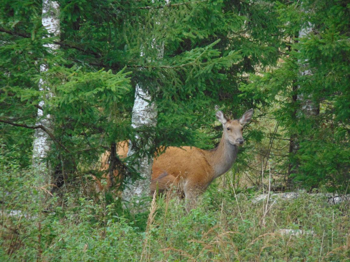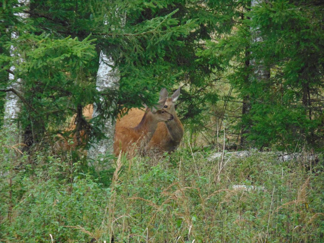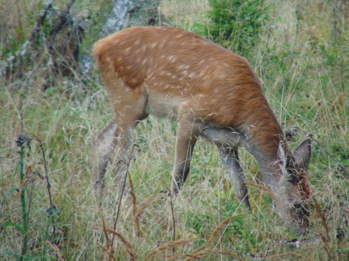 На обратном пути, к машине, я мотанул ещё кружок и повстречал ещё одну оленуху с телком и бычка пятилетнего с ними. Бых хороший, а оленёнок стоял в высокой траве. Уши только и видно. Это его и спасло.