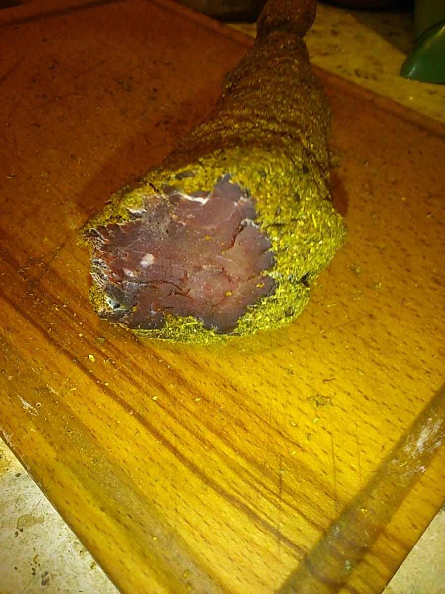 Сегодня попробовал, срезал с небольшого более подсушенного куска краешек, по соли нормально, острота присутствует :) (делал 2 вида смесей из специй, этот поострее), короче говоря к новогодним пиршествам как раз все созреет :ag: