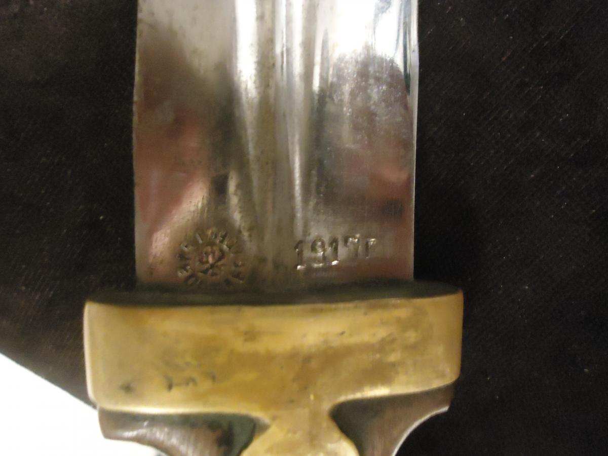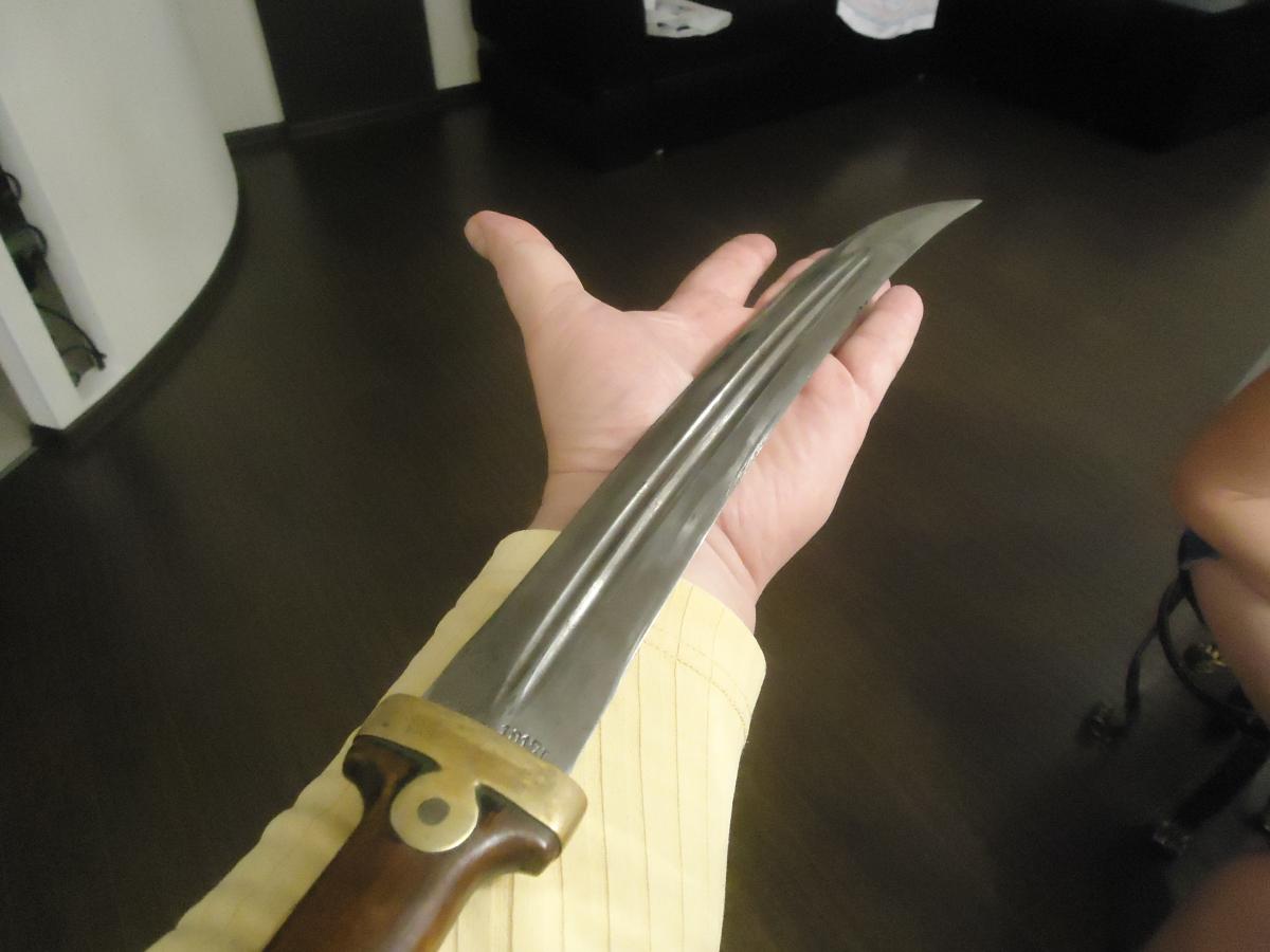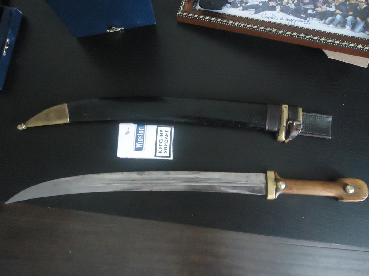Клинок имеет длину сантиметров 40 не больше. Сохран отличный, хлеб режет запросто. заточка двусторонняя. Изготовлен сей девайс в 1917 году в Златоусте.