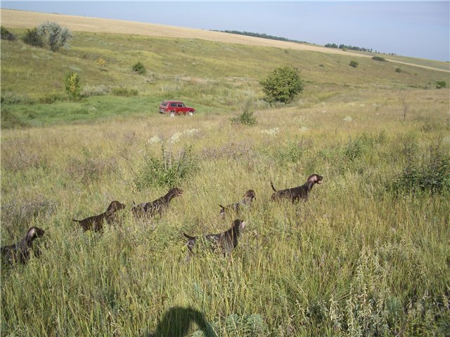 Начинают аппортировать с воды. Уже знакомы с птицей - перепел и куропатка. Делают свои первые стойки. Каждый день минимум по 1 часу проводят в поле. На питомнике 4 щена, два из них могут быть проданы. Более подробную информацию читайте выше.