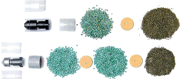 Фото 2. Начинка патронов «Искра-М» с бинарным (ППСт) и тринарным (ППСв) зарядами. Отечественный порох «Сунар 42» располагается в заряде первым и воспламеняется непосредственно формирующимся форсом пламени капсюля.