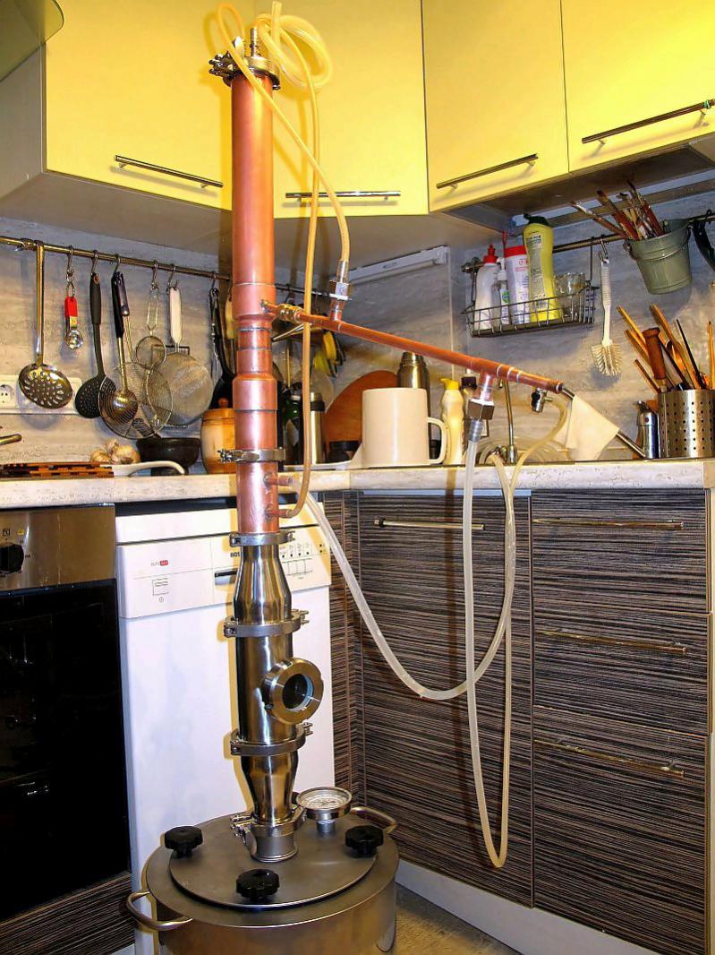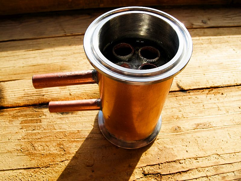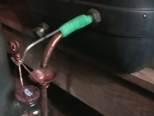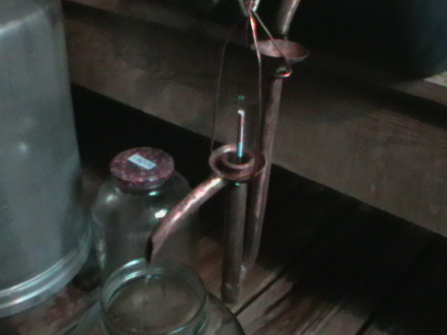 Внутреннее устройство сухопарника: по длинной распиленной трубке (распилена чтобы сильно не булькатила) пар приходит из фляги, по короткой уходит в холодильник. Банка из под майонеза на 1,5 литра Крышки на год не хватает, но ей цена в магазине 7 рублей. 2 отверстия пробить не проблема. Перекручиваем штуцера, и вперёд.