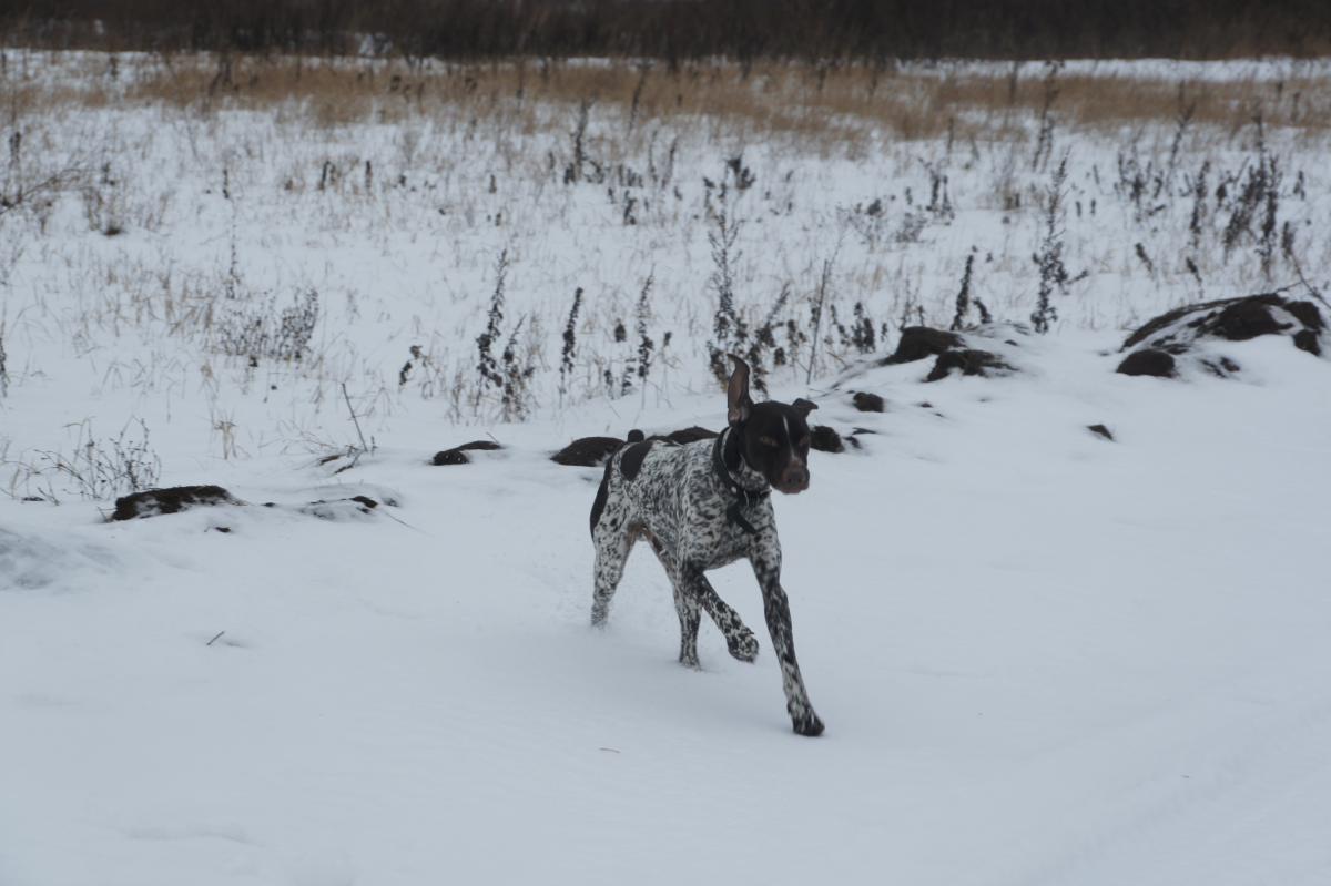 Гулял с ним несколько раз уже, смышленый пёс, не агрессивный, надеюсь будет хорошим напарником охотнику.
