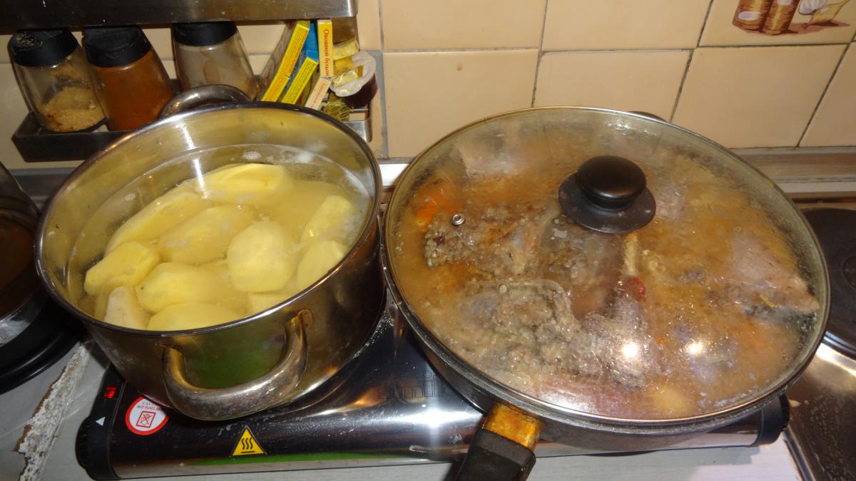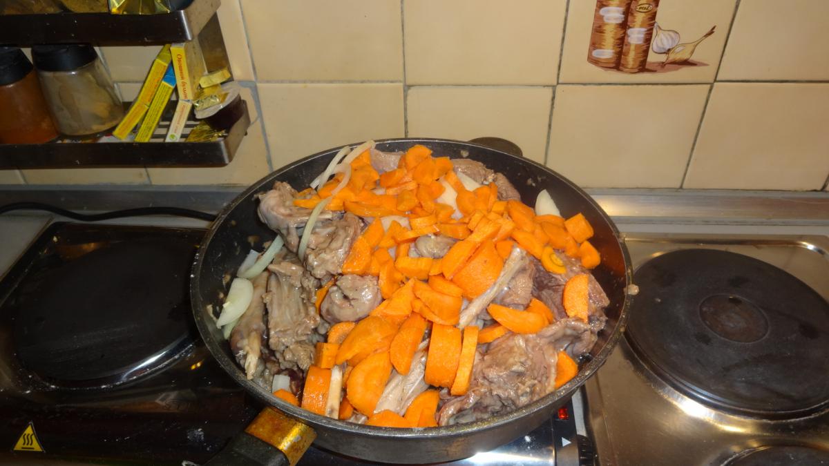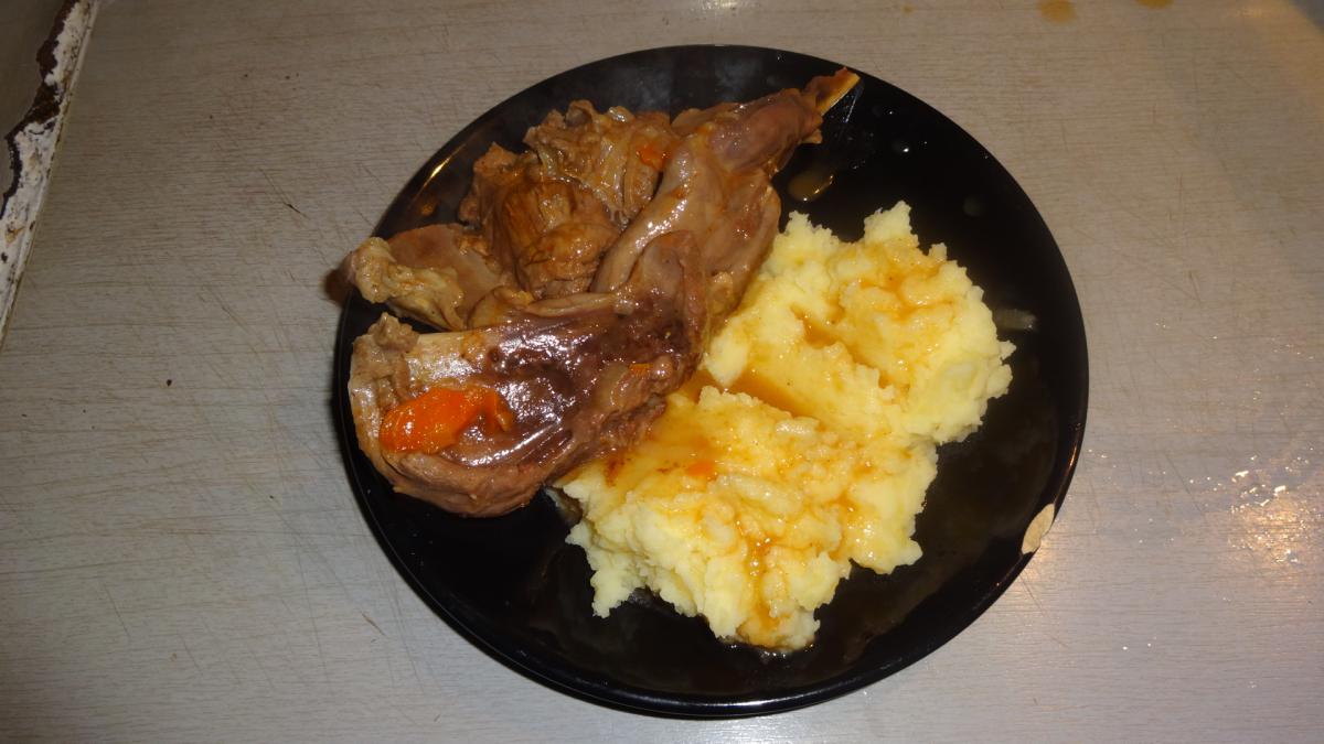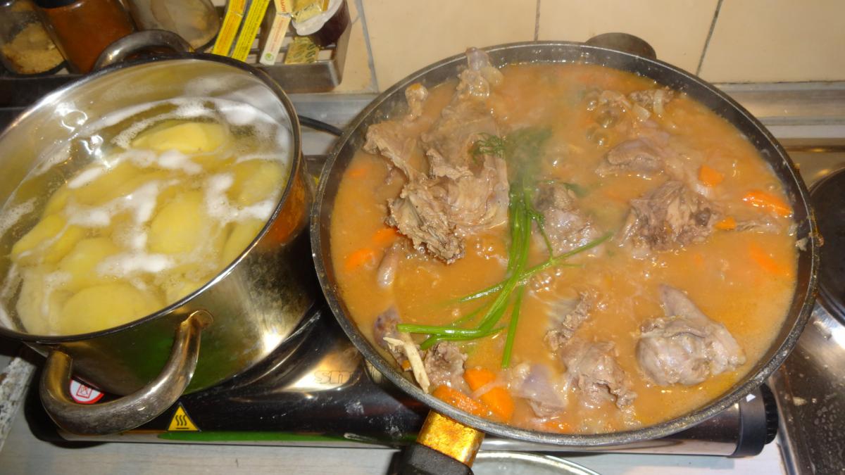 А вот что получилось из косого...ЗАмачивал 1,5 суток в молоке, потом в муке и на сковородку DSC02471.jpgОбжариваем, добавляем лук и морковь побольше, немного потомив, воды DSC02472.jpg...паралельно чистим картошку и варим ее... DSC02473.jpg...тушится все это дело минут 30, добавляем за 15 мин до готовности укром (веточкой) и чеснок DSC02474.jpg...а через 15 мин вот че получается DSC02475.jpg...Апупенская жрака, поверьте мне...Приятного аппетита..мне
