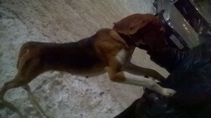 из контакта: "26.12.14 на передержку была забрана гончая - девочка 7- 8 лет , в жутком состоянии ( одни кости и кожа ). Завтра выставим фото . Сейчас отсыпается в тепле ( на диване ) ,очень адекватная, на кошек и собак реагирует хорошо . УМНИЧКА. Спасибо Павлу, что не оставил умирать на улице ( отвёз в вет. лечебницу ) и передал нам." Галина т. 921 636 52 88