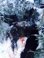 Секачок не великий , но крепенький откормыш , не далеко за сотню кг. Разделали быстренько. У Альмы нет ни царапинки тьфу-тьфу , повезло , у секача клык справа обломан почти до основания . Место удара мерседесом видно - гематома , но кости целы . Понятно , что болевые ощущения не дали уйти далеко , но по тому , как двигался , сказать, что подранок тоже бы было не правильно.