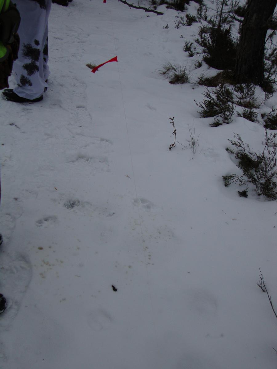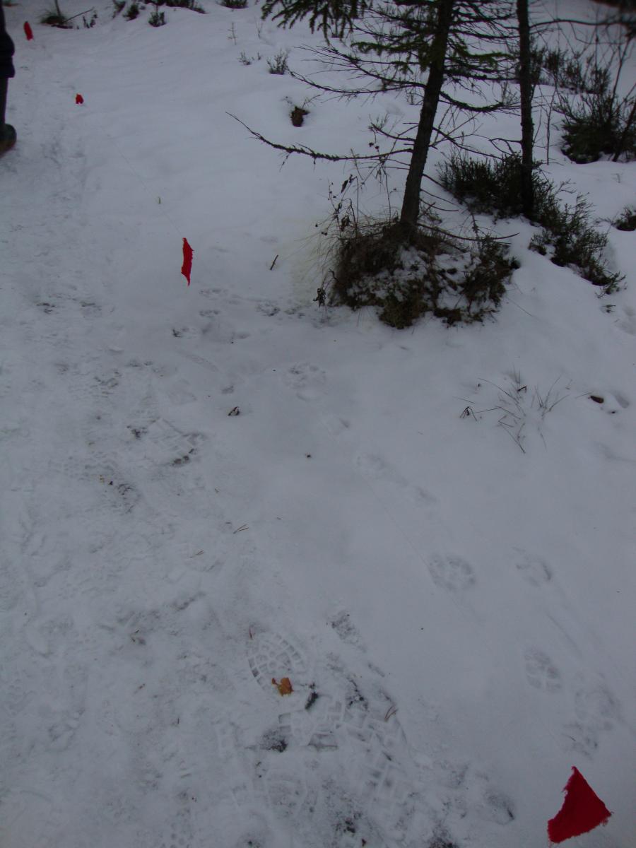 Друзья, при расстановке на номера, обнаружили следы выхода волков. В окладе действительно были волки! Кроме их следов обитания загонщики нашли кровяные пятна и куски шерсти и шкуры подсвинка.. после трапизы волки ушли.. причем местами флажки были повешаны высотой более метра и выше, о чем было сказано егерям на разборе полетов.. но волки ушли метаясь в доль фложков на десятки метров, возможно первой прошла матерая сука.. в месте где флажки были скручины в трубочку ветром.. второй же след под фложками 60-70 см как и первый, в 10ти метрах дальше.. жаль.. но следы были свежими.. участники сего выложат фото этого места и выхода..