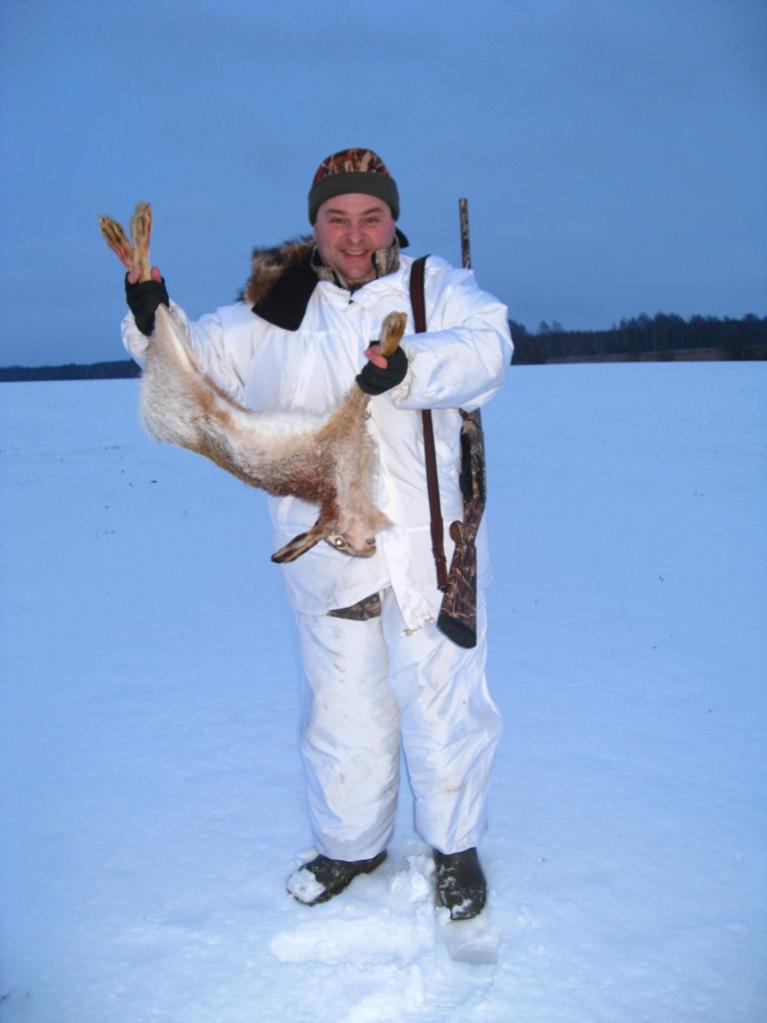 Зато в конце 3 загона один из номеров (Юрий) поднял русака в нескольких метрах от своего номера (бывает же!). Дуплет Юрия по убегающему зайцу... и заяц улепетывает на всех парах, правда все-таки Юра его зацепил. Одна дробинка зацепила пузо, по следу изредка обнаруживались следы не то крови, не то лимфы (капельки были больше желтые, чем красные). Ну и дальше пошла погоня за зайцем. На подранков лосей иногда столько не тратится сил и внимания, как в этот раз на зайца. Пытались обрезать, но он всё улепетывал дальше и дальше (поле за полем), хотя лежки тоже встречались. Потом потеряли, провели 4 загон... потом опять обнаружили следы, потом опять потеряли, уже бросили и поехали в сторону базы, но опять нашли скидку. Решили напоследок пройти по следу цепью. В этот раз повезло мне, я шел крайним слева цепи, уже по чистому полю (следы зайца шли по краю растительности), заяц поднялся из травы метрах в 20 от меня и полетел на чистое поле. Стрелять было удобно, так что одним выстрелом я добил нашего подранка. Вот такой трудовой русак получился на команду.