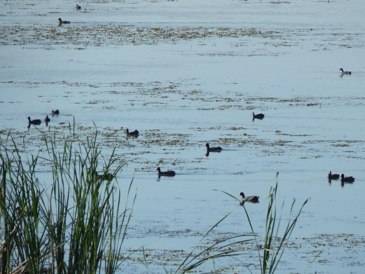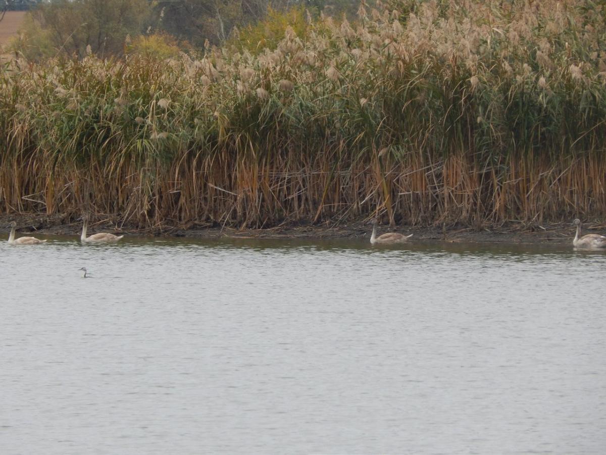 Население водоема-огромные стаи лысух, лебеди-шипуны, белая цапля .