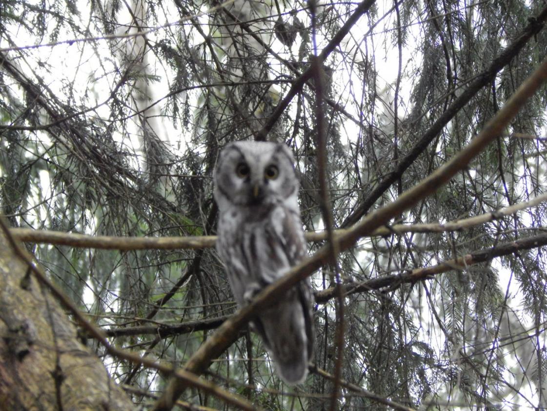 мохноногии сыч , смотрит на лаек и на меня