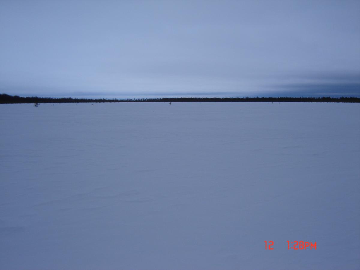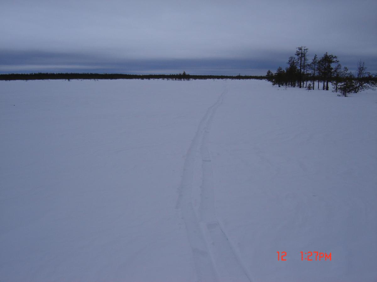 С вечера поселившаяся мысль не дает спать, в пять подрываюсь , рюкзак собран прыгаю в самолет, лечу. На градуснике- 0. Пролетев до места 200км. уже минус 2, радует. Встаю на лыжи, вперед. Нравится , дело пошло. Мухой перескакиваю заброшенное поле. Ну коли дело пошло ,решил по дуге пройтись через лес, выйти к ручью ну и потом к цели. Дневное время потихоньку тает, а чем ближе ручей и выход из лесу лыжи мои потеряли первоначальную легкость в передвижении. Но настрой еще боевой и борется с периодически прилипающим к лыжам снегом, который перестал рассыпаться. Время тает уже катастрофически быстро и начинаю понимать, что посветлу оставшиеся 10 из 14 км не пройти. Продолжаю путь по дуге и к вечеру замыкаю круг при температуре за бортом плюс 3. Ну "шо", готовлюсь технически, и теоритически,к следующему заходу...