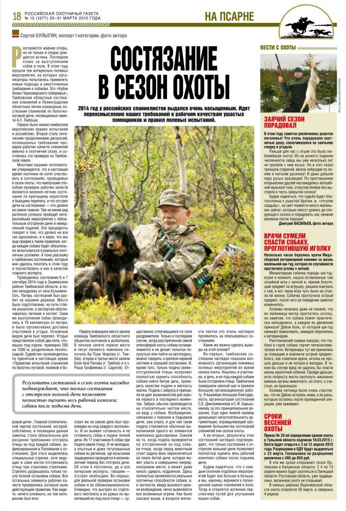 26-27 апреля 2015 года в Питере, ожидается рождение, от рабочих собак, щенков породы русский охотничий спаниель. Предполагаемый окрас щенков: черные, черные с подпалом, черно-пегие, черно-пегие с подпалом.