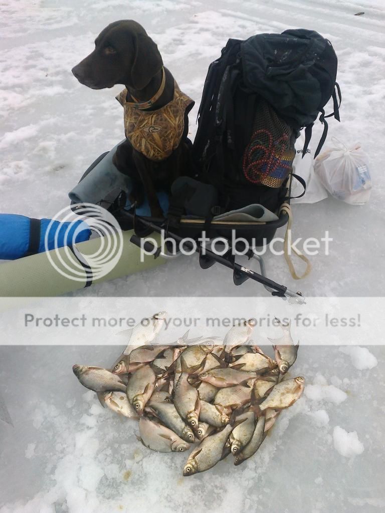 ловля в которой с собакой априори вызывала наибольшие опасения. Ведь в 2х метрах диаметра с раскладушкой, ящиком и пр. скарбом одно неосторожное движение, когда леска на льду, - и прощай удочка. Но Гай, как настоящий солдат, беспробудно проспал всю ночь и утро, и даже когда выспался, не проявлял особого желания покидать належанную теплую куртку. В общем, поездка прошла "на ура", жаль только, что подлец был весь мелкий