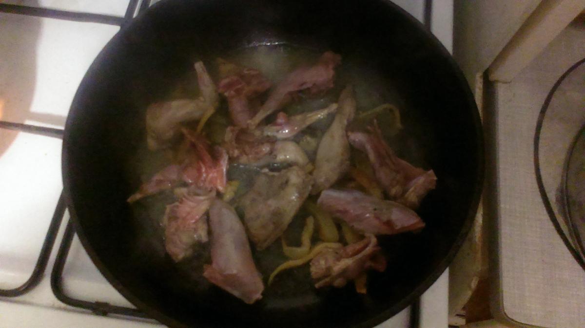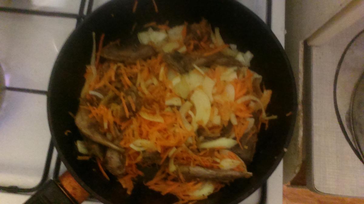 Пока мясо обжаривается натираем морковь,режем лук и отправляем все на сковороду.