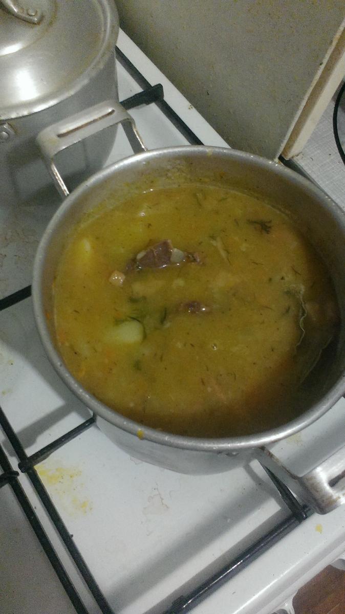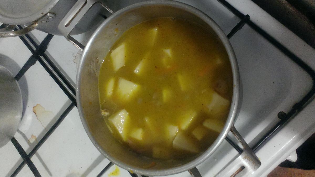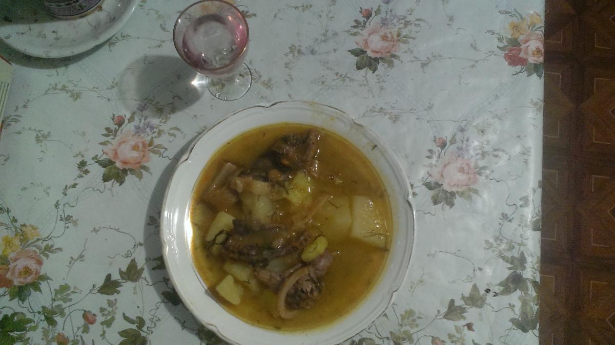 Чистим картошку,режем крупными кусками и вместе с мясом отправляем в кастрюльку.