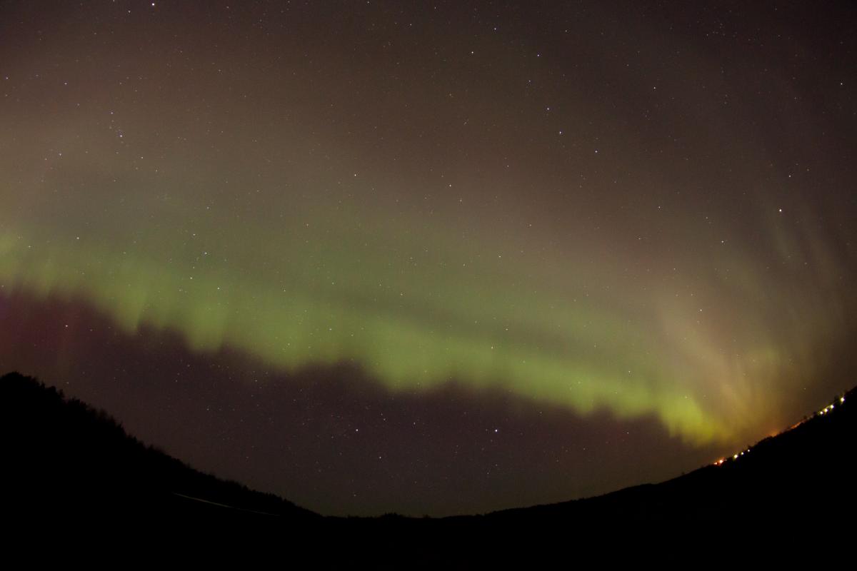 Сияние снова опустилось к северу, где полыхает узкая зеленая полоса.