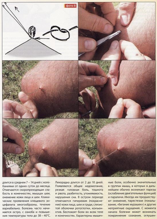 дальше костюм с плотными манжетами, лучше светлый - на нем клещи видны очень хорошо, костюм обработать отравой от клещей, но только не которая отпугивает, а которая убивает.