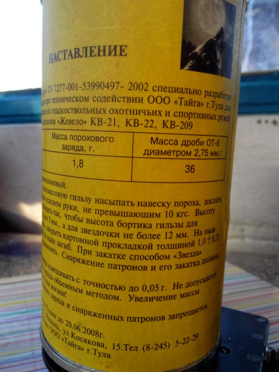 Судя по рекомендации на банке указанная масса снаряда и заряда дана для ПК и "звезды". По навеске порох идентичен итальянскому МВ-36. Сейчас найду журнал и сфотографирую данные патрона "Тайга". Дробь в отстреле N5.
