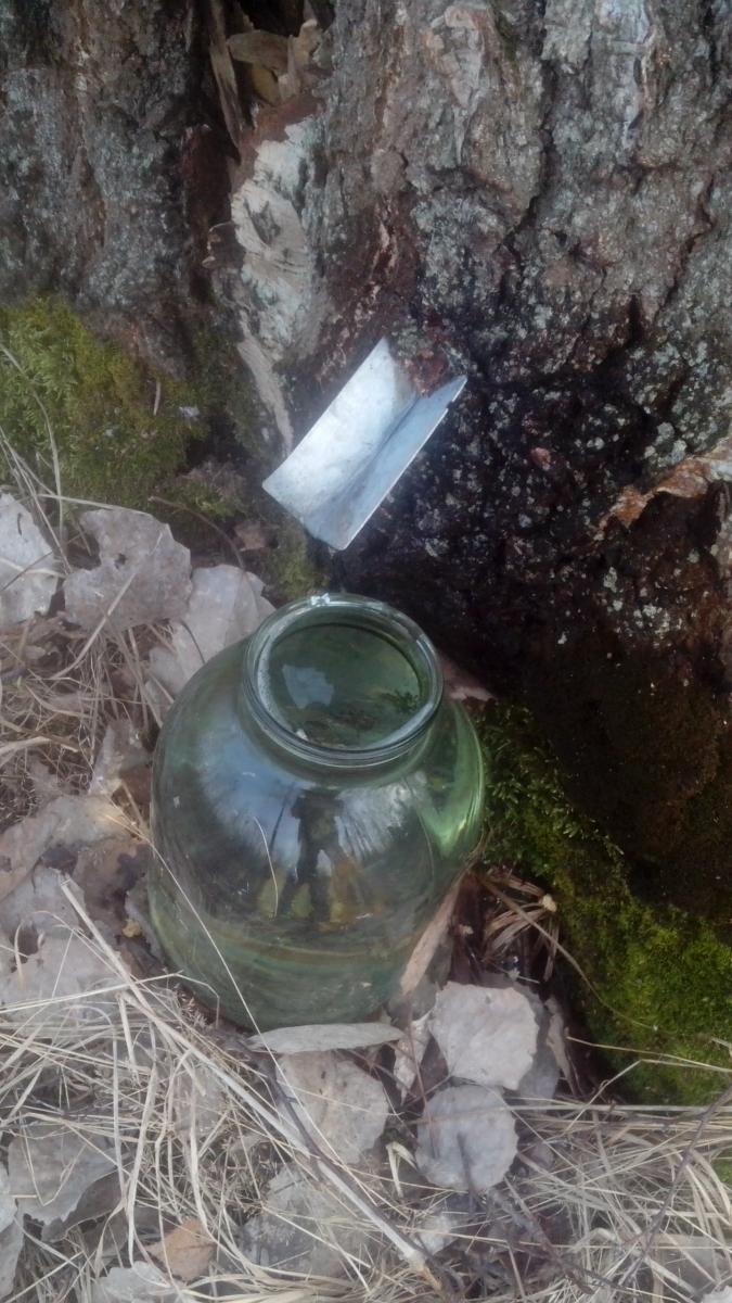 21-го марта был в деревне, под вечер поставил желобки на две березы. До обеда следующего дня собрал около 15 литров.