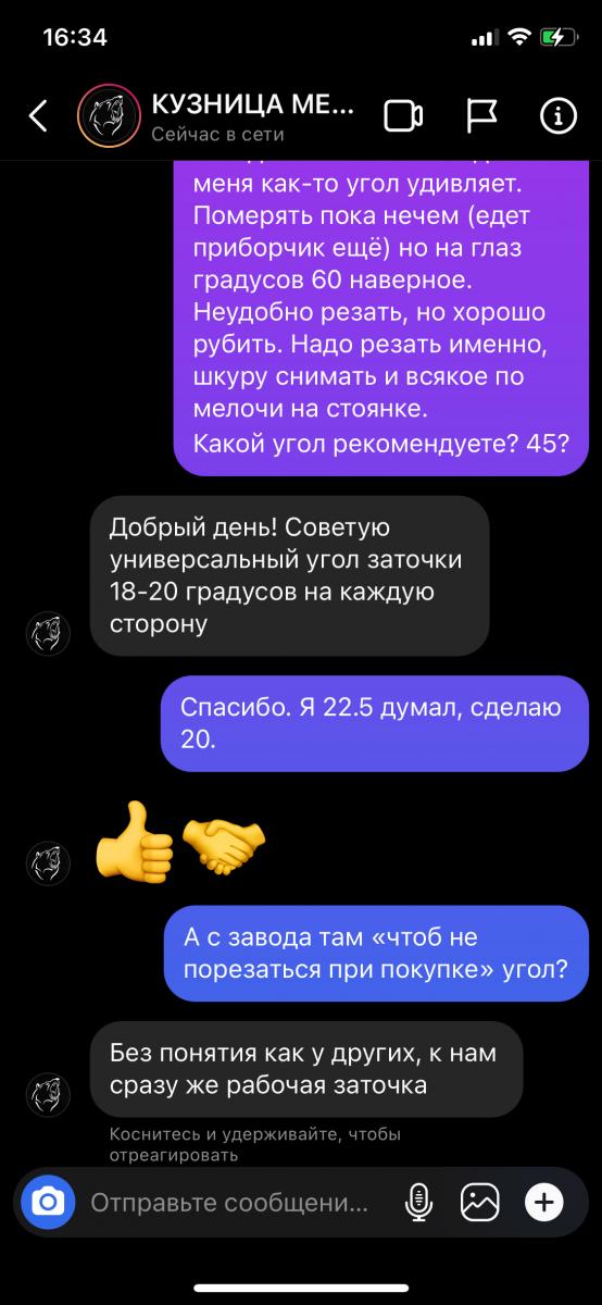 На 20 град точатся кухонные Японцы для нарезки суши и всякого нежного. Для экспедиционного 40-45 градусов норм. Имеется в виду полный угол, а не угол на сторону.Точи на 20...