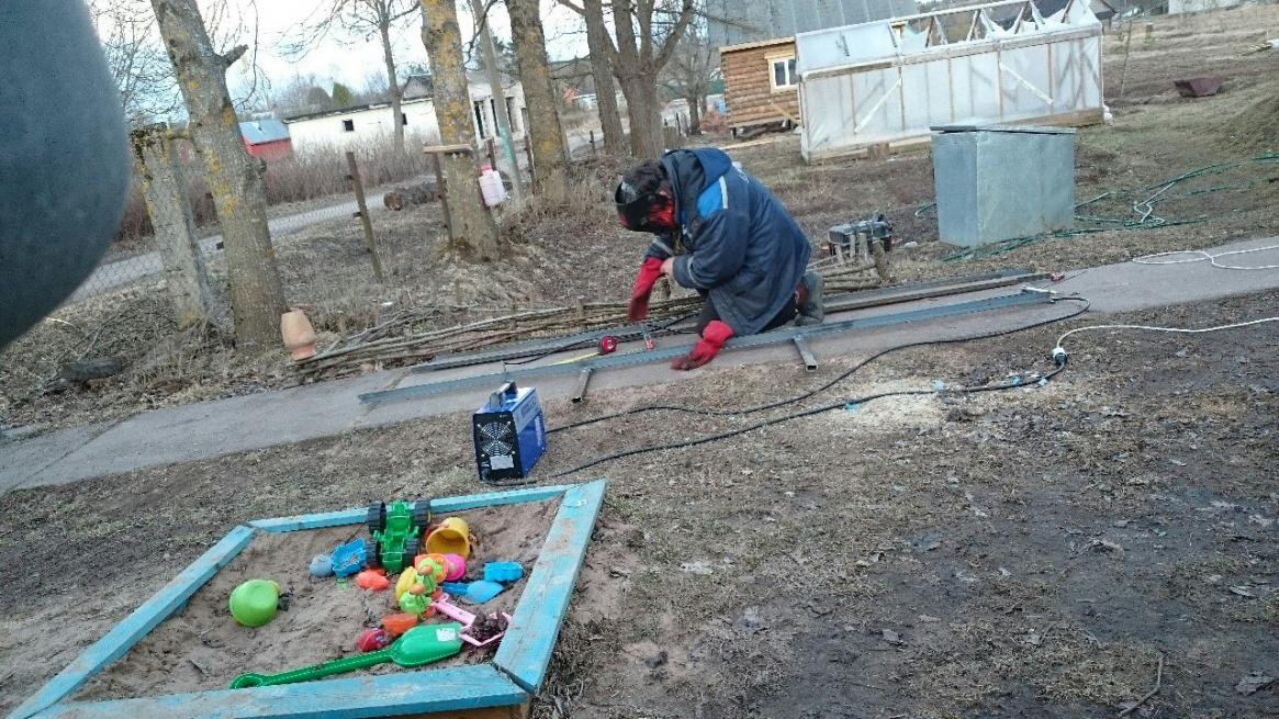 Для начала свариваем основную трубу и ноги. Ноги через метр, на коротких сторонах крайние ноги не ставить. Они там будут при стыковке. Ниже основной трубы, через 15 см. варим усиливающий пояс из уголка. Самое главное, перед нарезкой металла, промерьте комплектующие теплицы. У моей теплицы длинная сторона была заявленные производителем 4 метра, а торцы оказались 2.98 м. Если не промерять перед сваркой фундамента, при опорной ширине 25 мм. можно некисло пролететь.