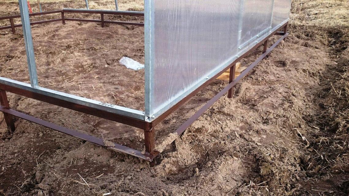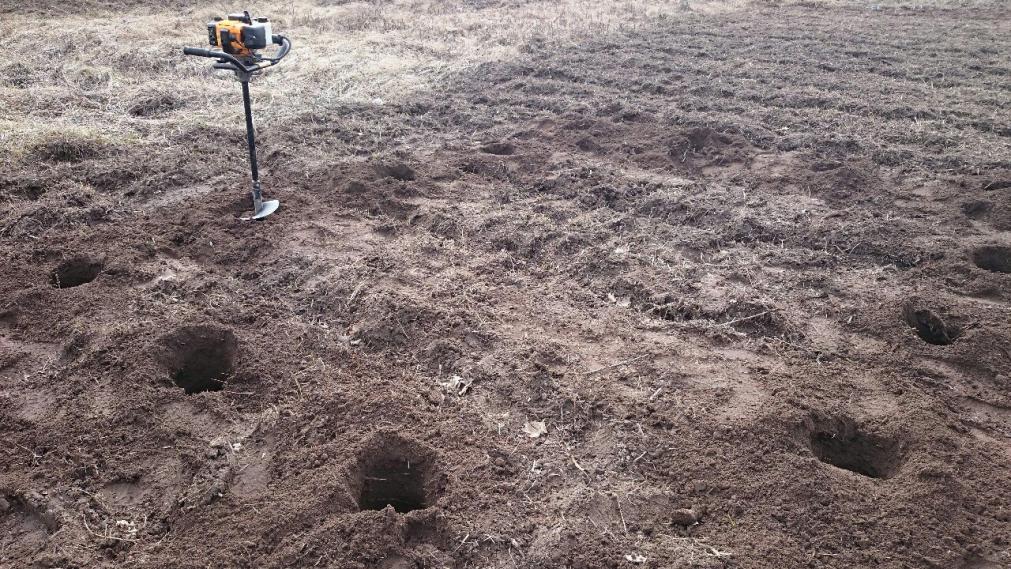 На некоторых ногах видны поперечные "якоря", для лучшего удержания в грунте. Можно приварить их хоть на все ноги, но сделал только четыре. И как показал недавний ураганный ветер, сваливший забор у соседа, этого вполне хватает, теплица стоит намертво. Итак, продолжим. Пока сохнет краска идём на намеченное место установки теплицы и делаем ямки под ноги. Можно лопатой, но мотобуром проще и быстрее.