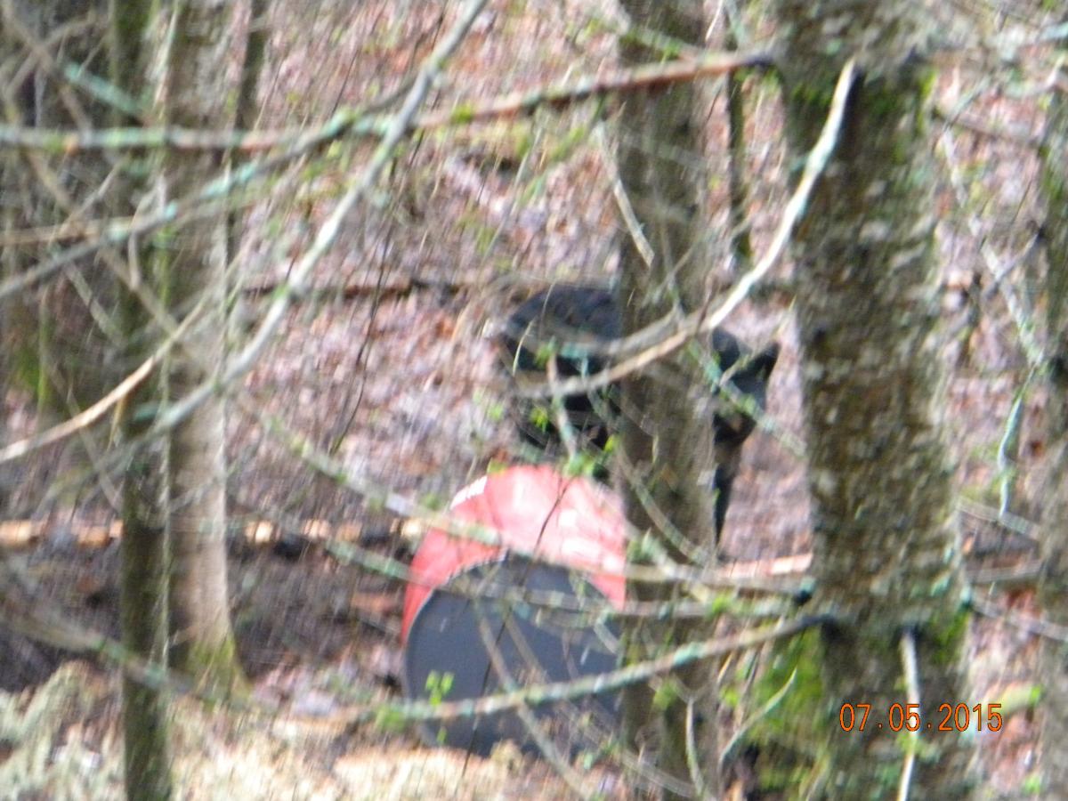 Меведь гребет из бочки , жует , как собака , поглядывая по сторонам , но не встает. Он лежит боком ко мне . Может не самый лучший выстрел, но что от него мне еще ждать? Если поднимется и сразу уйдет , за приваду, могу остаться без выстрела.