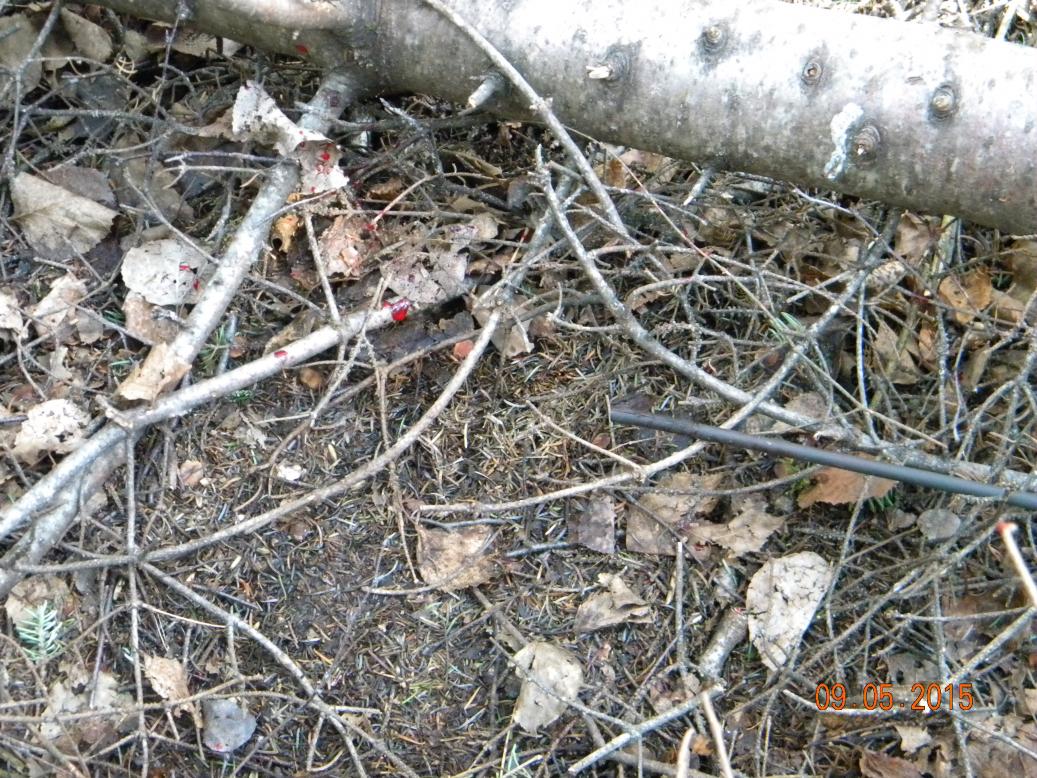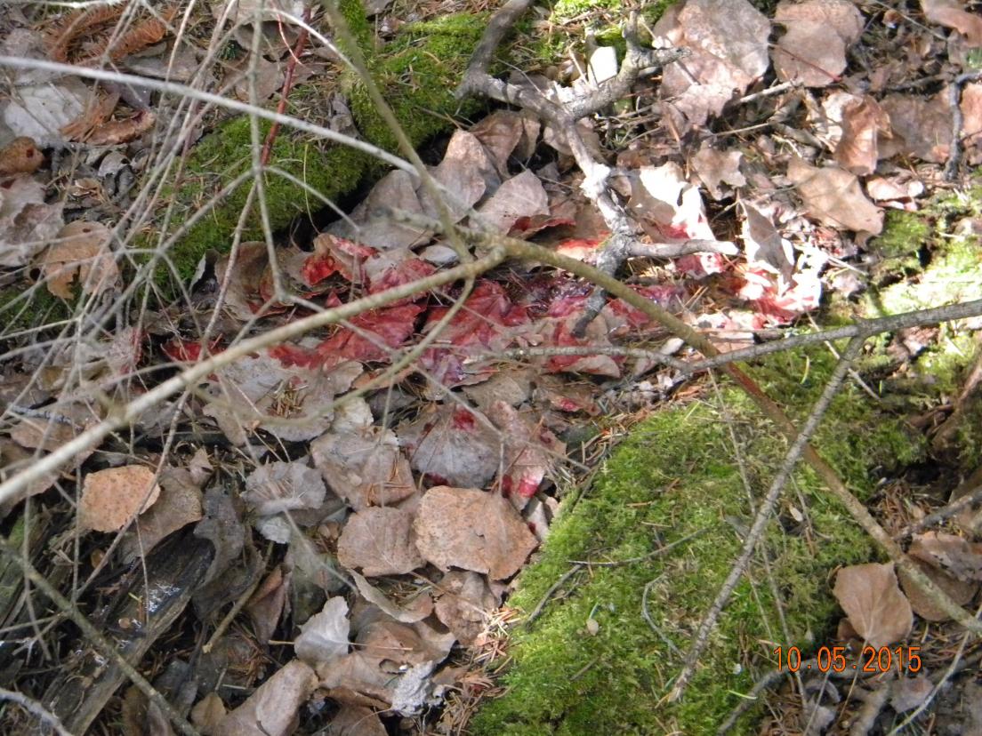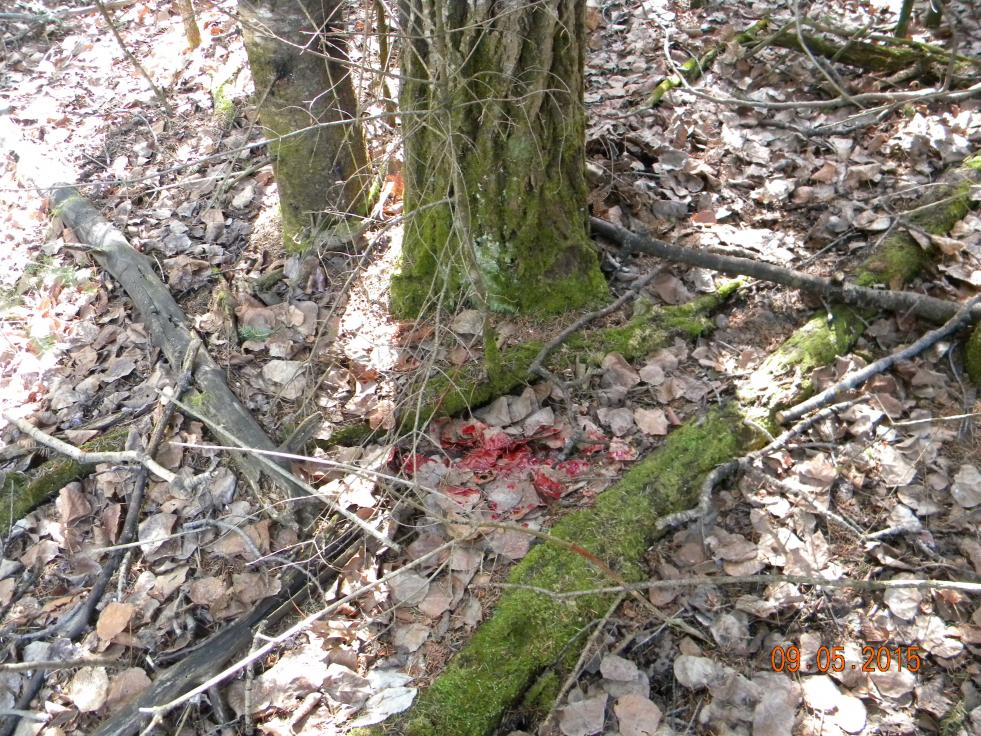 Окрашенная бурой кровью стрела лежит на месте стрела. Передняя ее часть , почти наполовину в медвежьей крови с прилипшими шерстинками. Почему то нюхаю ее. Легкий запах зверя..Наконечника нет,обломился внутри. Лужа крови на месте ,где зверь бился.Кровью измазаны стволы ближайших деревьев и кустов. Пропаханный ,как бороной, волокущийся след медведя уходит в очень плотнный хвойный подрост, настолько плотный , что я не могу протиснуться вовнутрь, сквозь плотно сомкнувшиеся сучкастые стволики. Нижние сучья отмерев ,высохли на стволиках.Именно ими так трещал уходящий зверь. Кора елочек в крови ,лужа на входе ,где зверь сидел..Вторая лужа рядом с остатками прозрачной с сукровицей слюны.