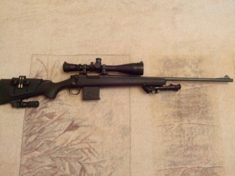 4. Материал ложи: HS ложа с алюминиевой шиной, тригергард HS с внешним магазином ( в комплекте 2 металлических магазина от HS на 4 патрона, 2 адаптированных пластиковых 10 зарядных магазина от AI), установлен аналог щеки Карстена с патронташем на 2 патрона. Монопод. Раздельный вивер Ствол вывешен. Доработан спуск -УСМ Х40 (полировка, пружинки, отрегулирован на усилие 200 гр)