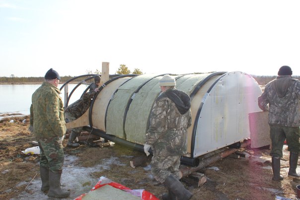 каркас из пластиковых труб -фанера-минвата-поликарбонат-мох.пол доски.завозили по зиме на Арго часть на хребте носили ,часть на месте пилили.как сделано?,почему сухо ведь болото же?сверху это мох?